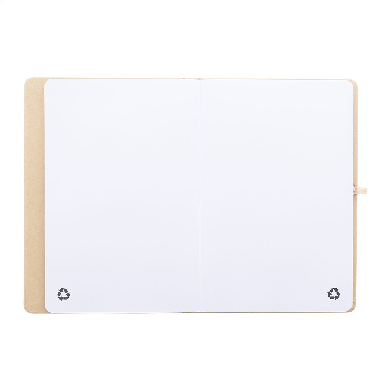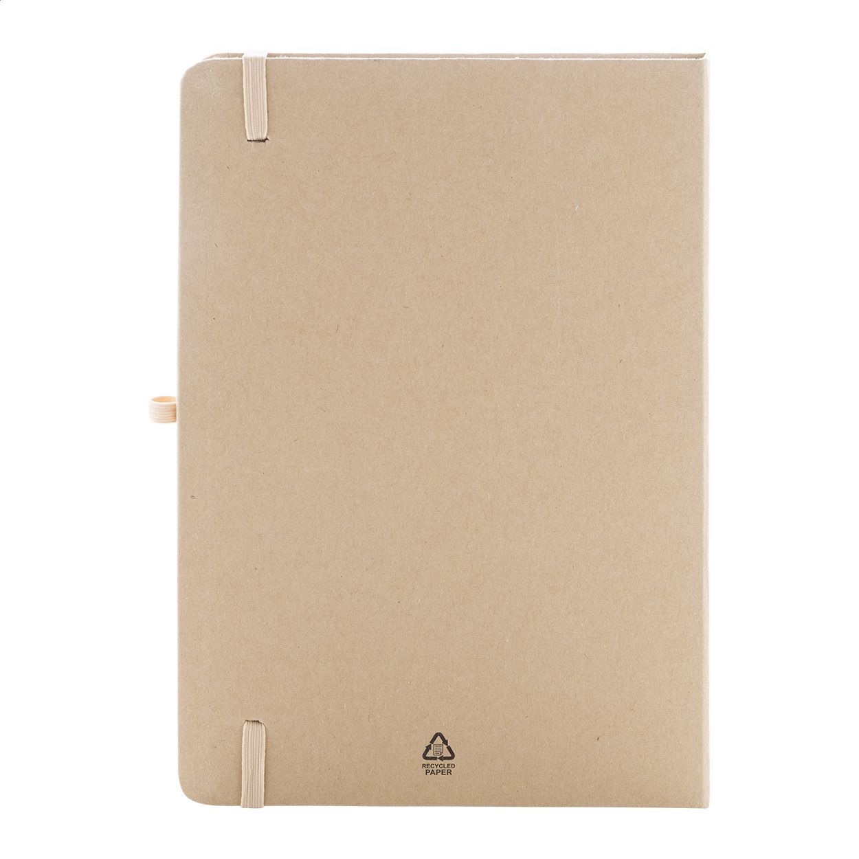 Quaderno formato A5 con copertina in cartoncino riciclato, 70 fogli in carta riciclata, elastico e portapenne. La copertina interna integra 25 foglietti adesivi, 125 segnapagina e una tasca portacarte.
