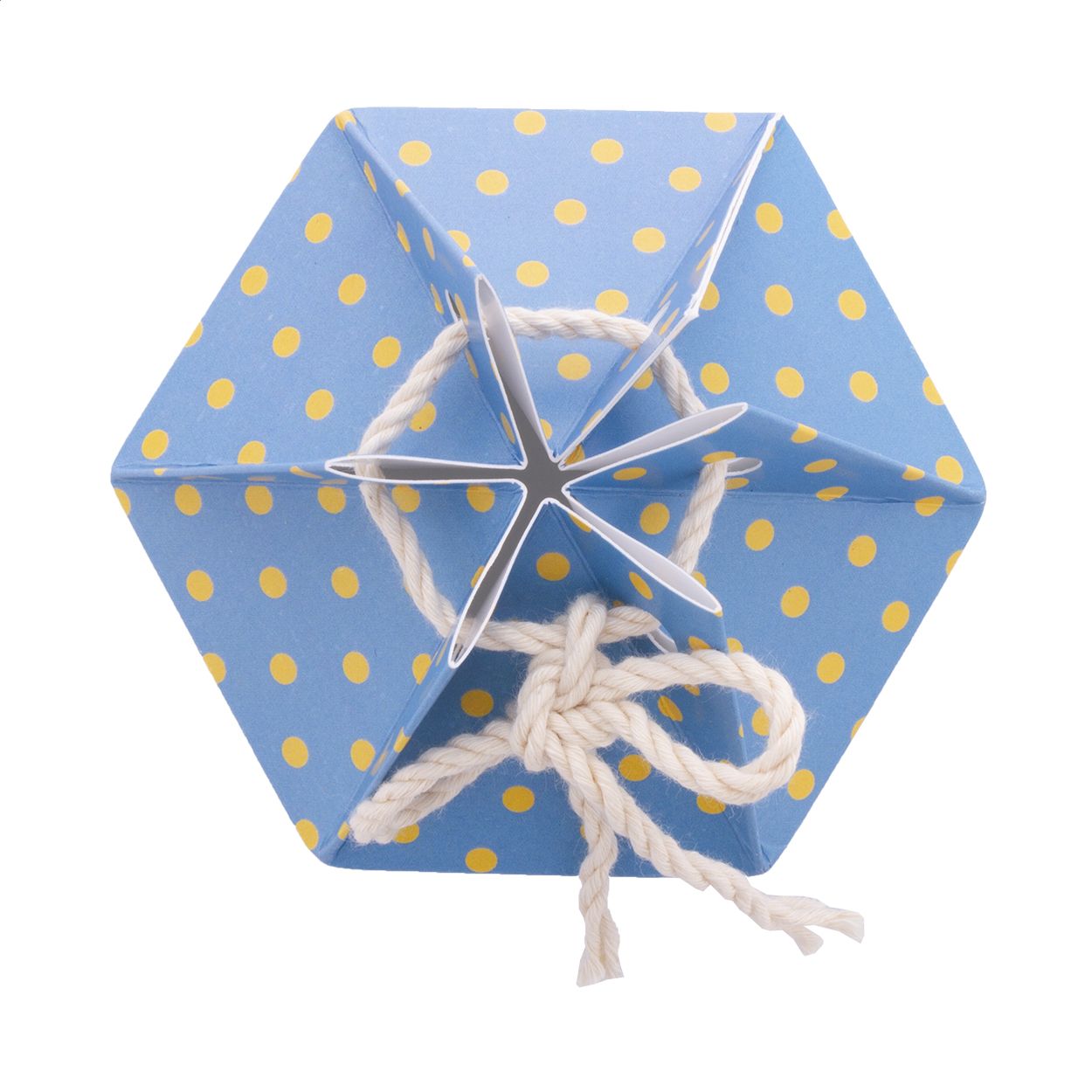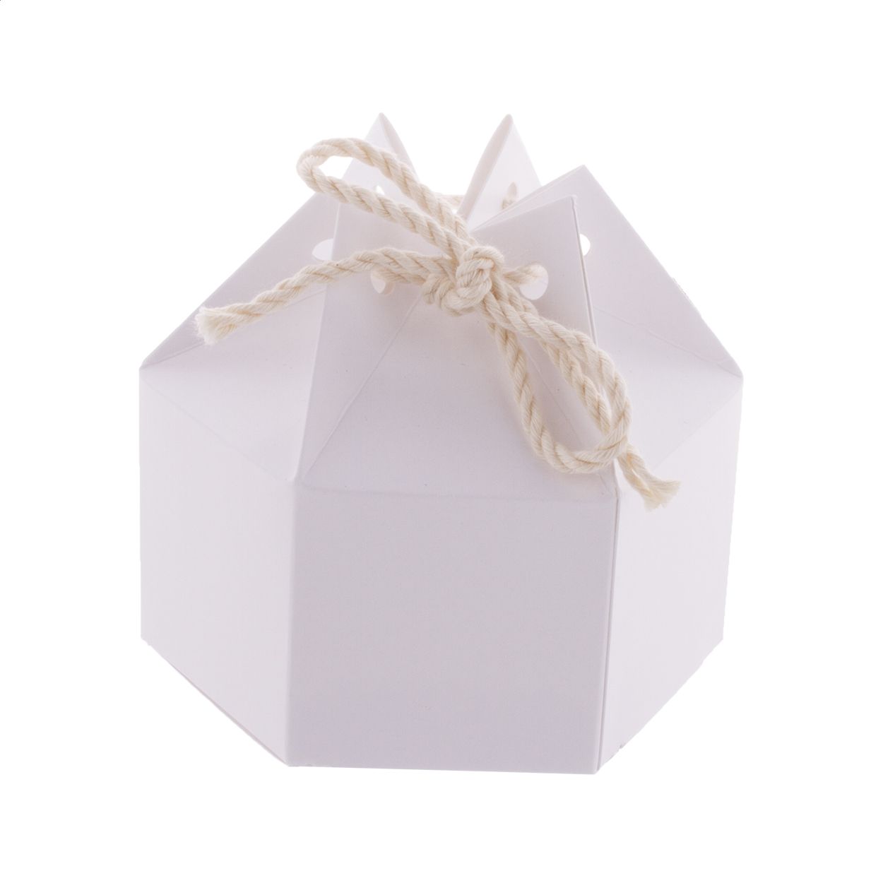 Scatola regalo esagonale in cartoncino personalizzabile a colori, con chiusura a cordoncino. Imballo in confezione piatta. MOQ: 50 pezzi.