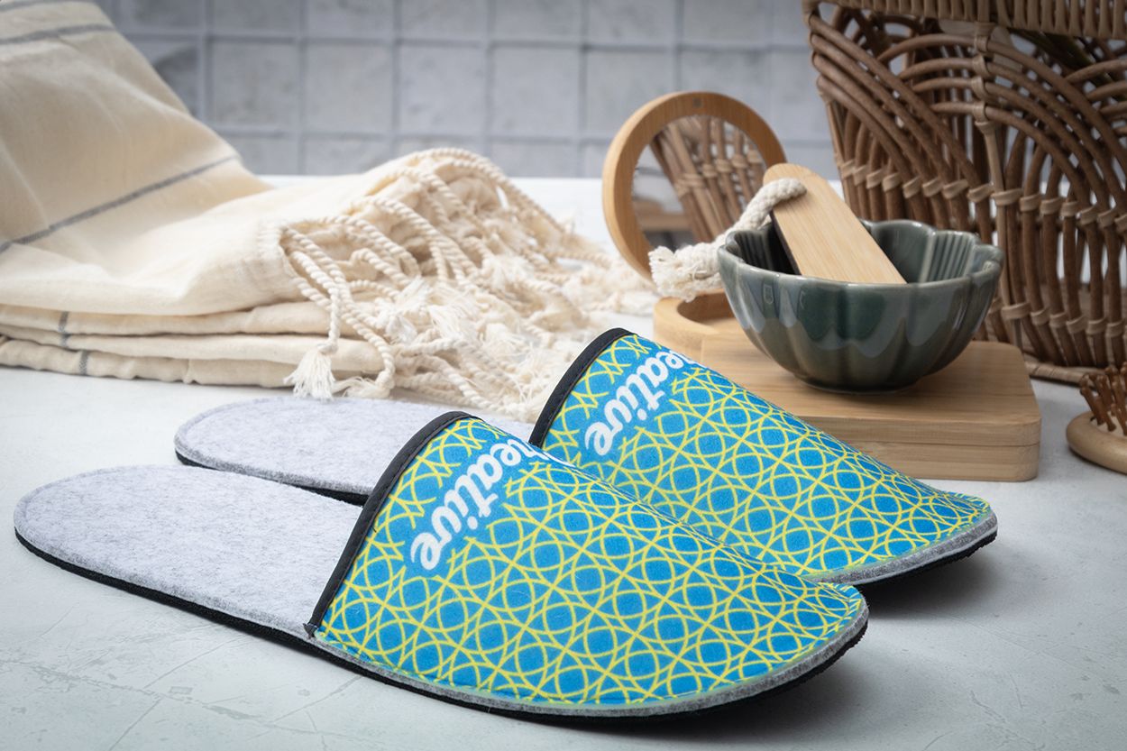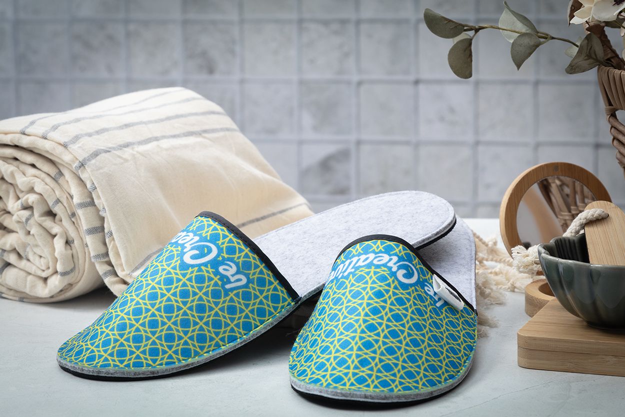 Pantofole in feltro RPET con parte superiore stampata a colori, suola in gomma antiscivolo ed etichetta RPET. Il costo comprende la stampa in sublimazione. MOQ: 25 paia/taglia.