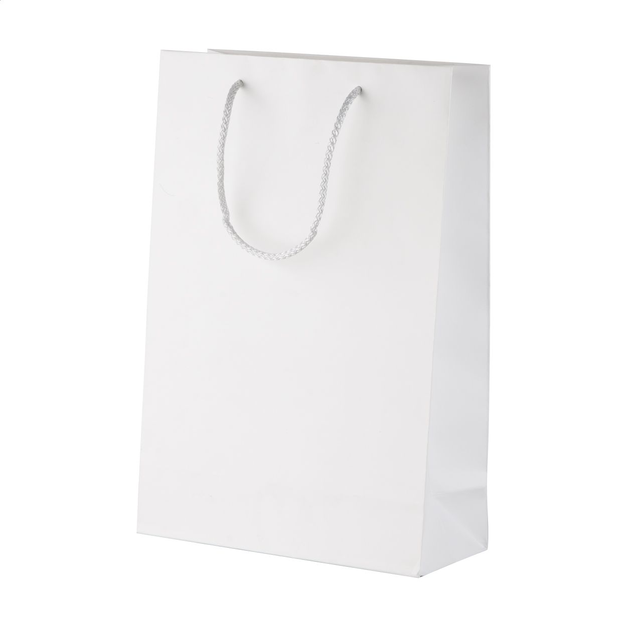 Sacchetto in carta personalizzata con manici in polipropilene. Con stampa offset a colori. MOQ: 500 pz.