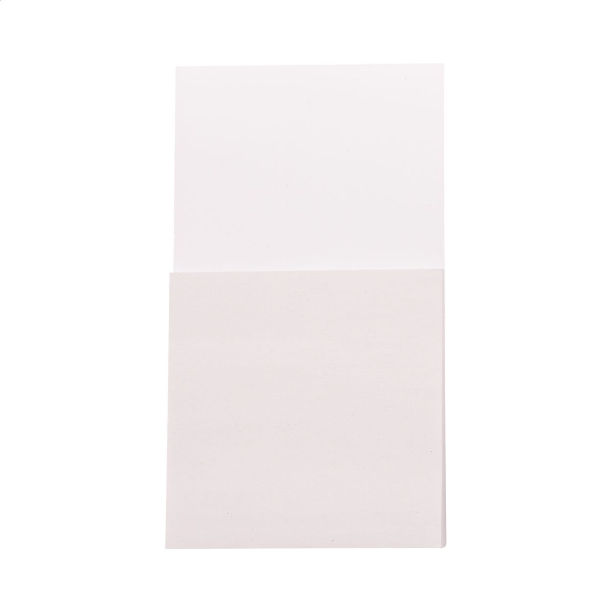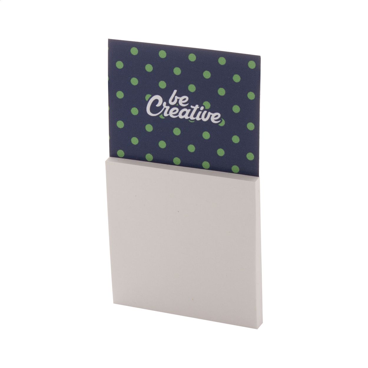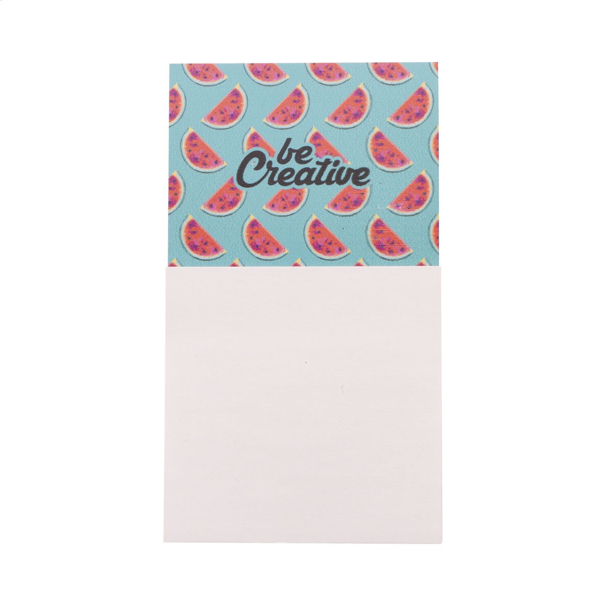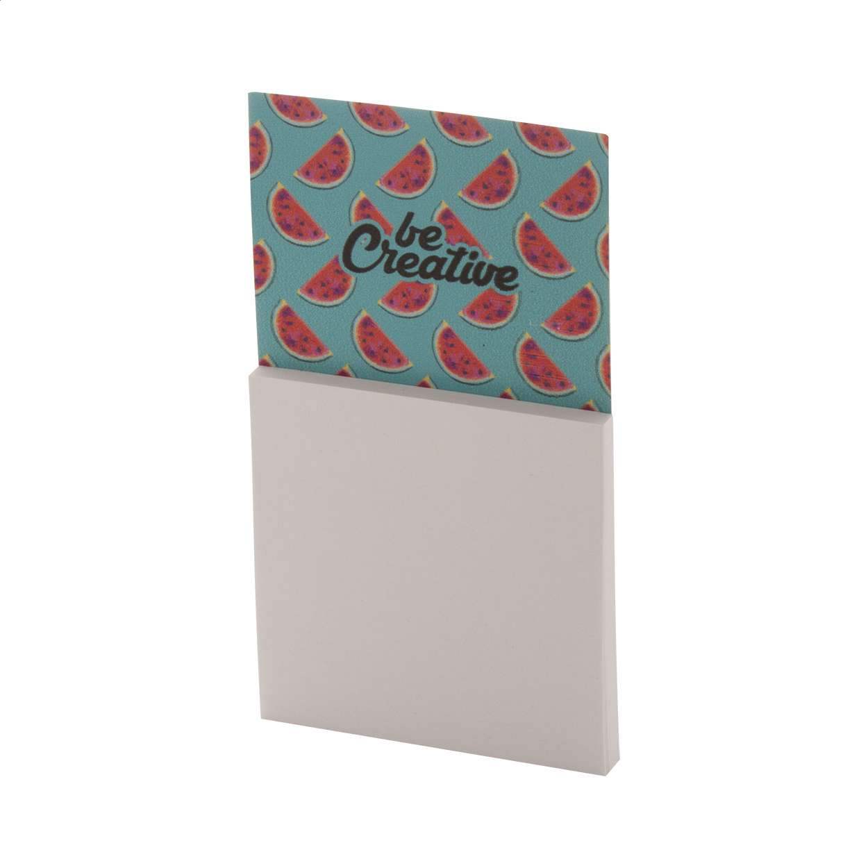 Magnete da frigo personalizzabile con stampa in quadricromia, con blocco di 50 foglietti adesivi in carta riciclata (75×75 mm). MOQ: 100 pezzi.