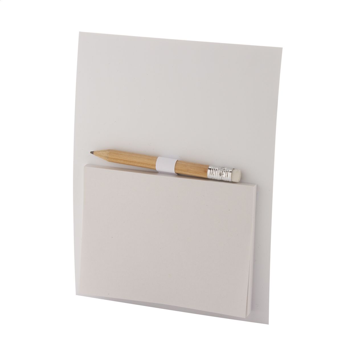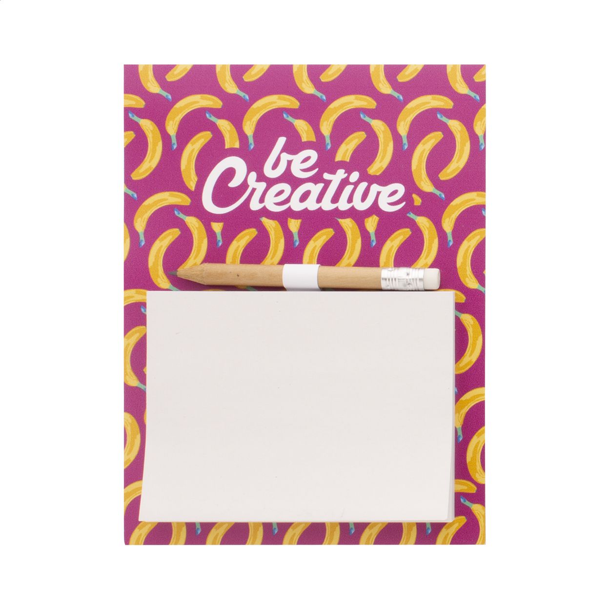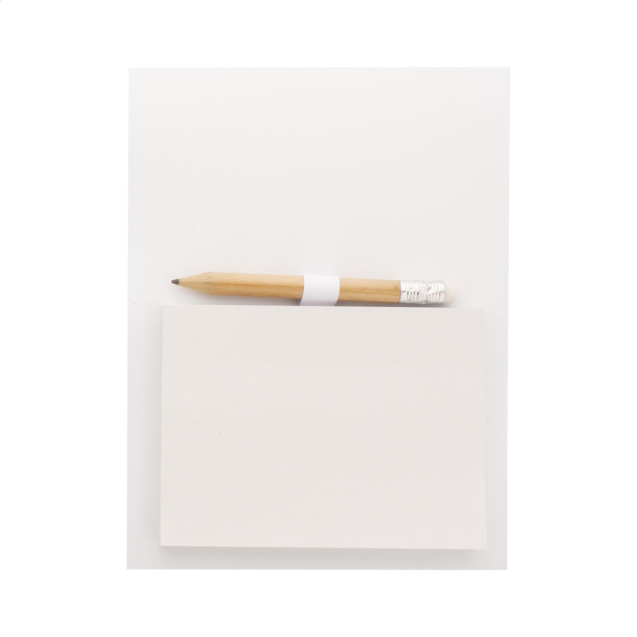 Magnete da frigo personalizzabile con stampa a colori, blocco di 50 foglietti adesivi in carta riciclata (100×75 mm) e mini matita di legno. MOQ: 100 pezzi.