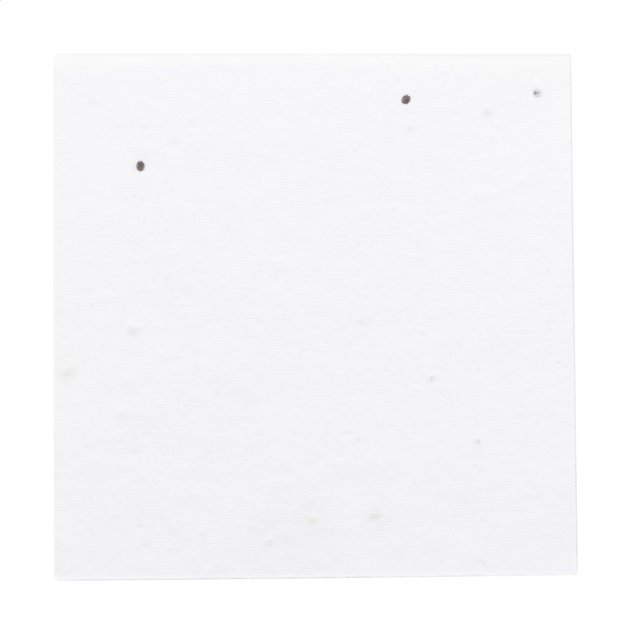 Blocco per appunti personalizzabile, con copertina in carta di semi di fiori selvatici assortiti. Include 50 foglietti adesivi in carta riciclata (75×75 mm). Il costo comprende la stampa a colori della copertina esterna. MOQ: 100 pezzi.