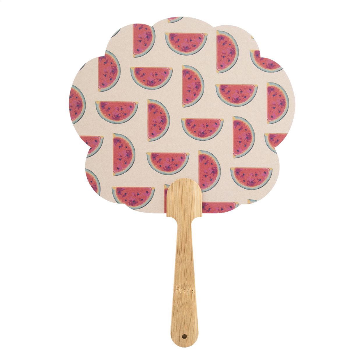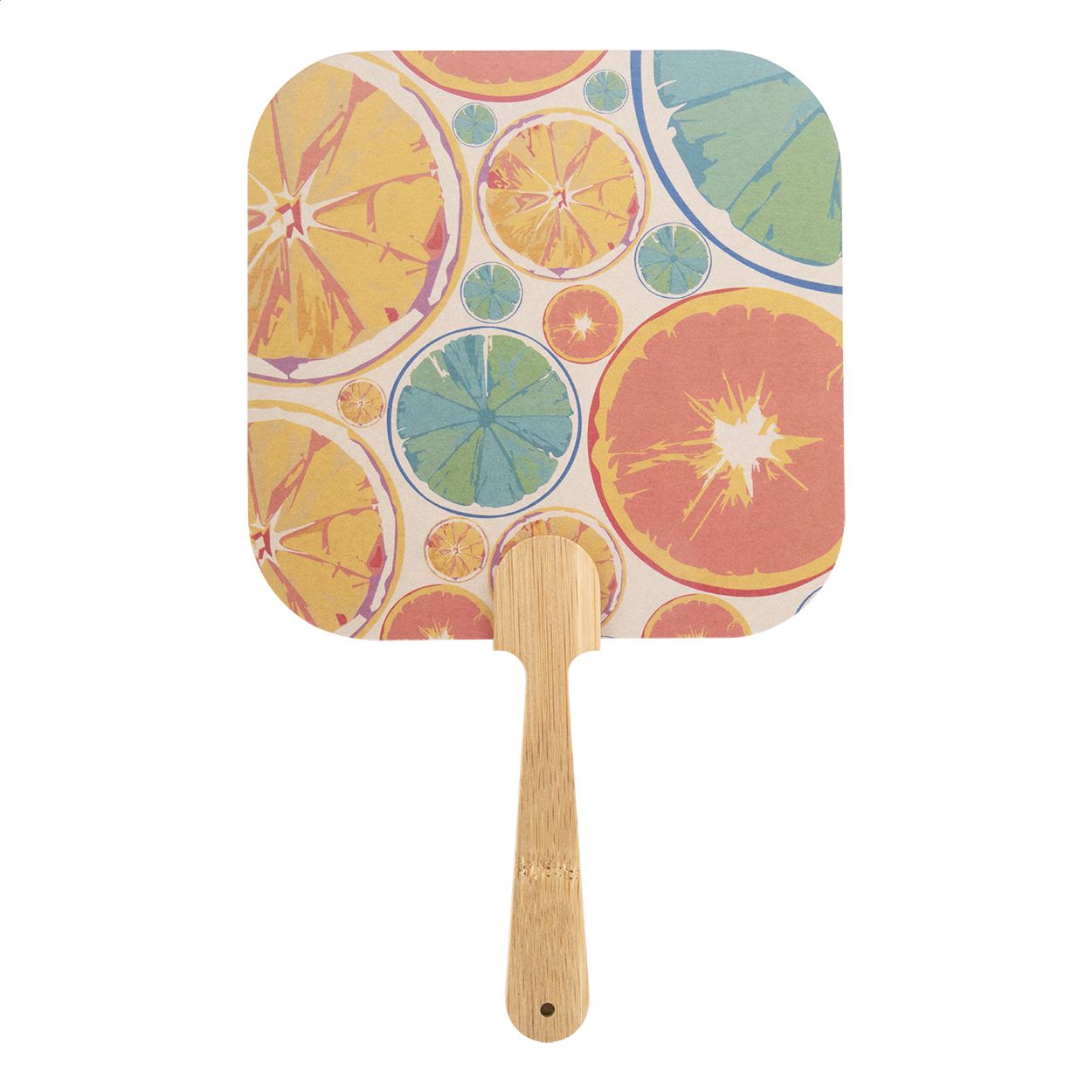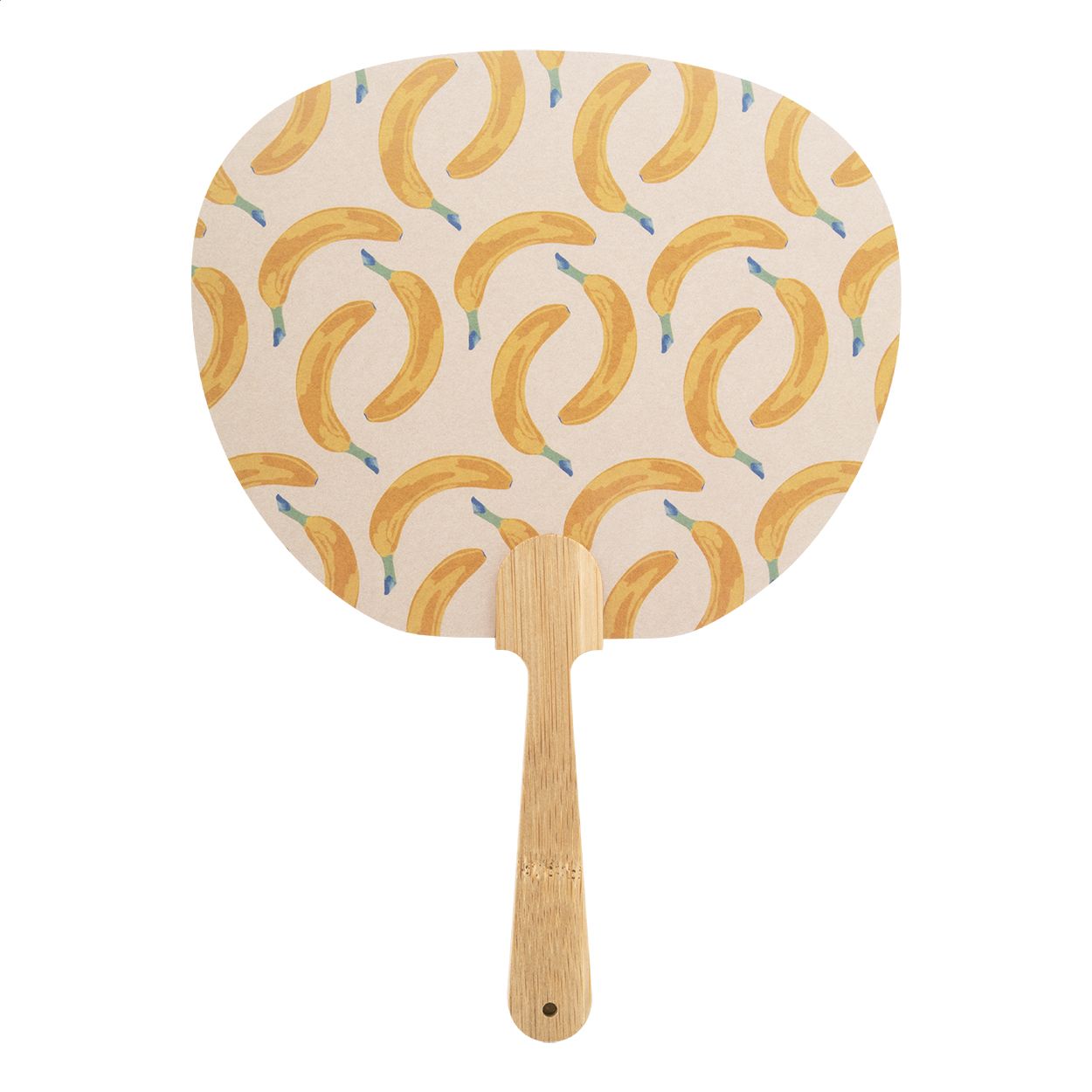 Ventaglio personalizzabile con manico in bambù e carta kraft. Stampa digitale personalizzata su entrambi i lati. MOQ: 100 pz.
