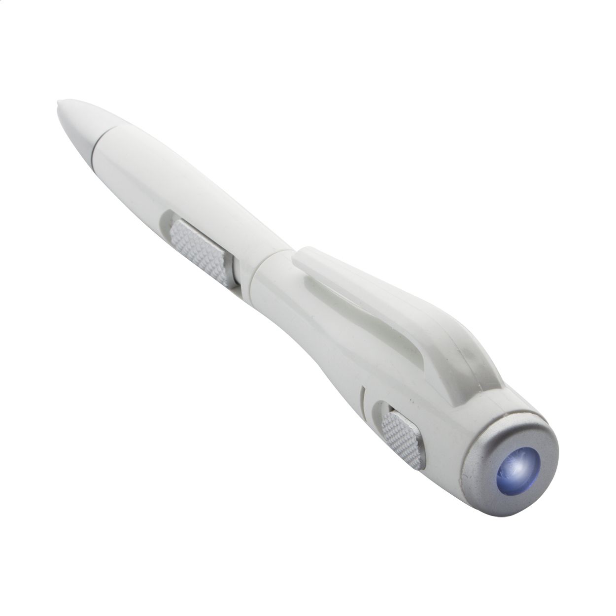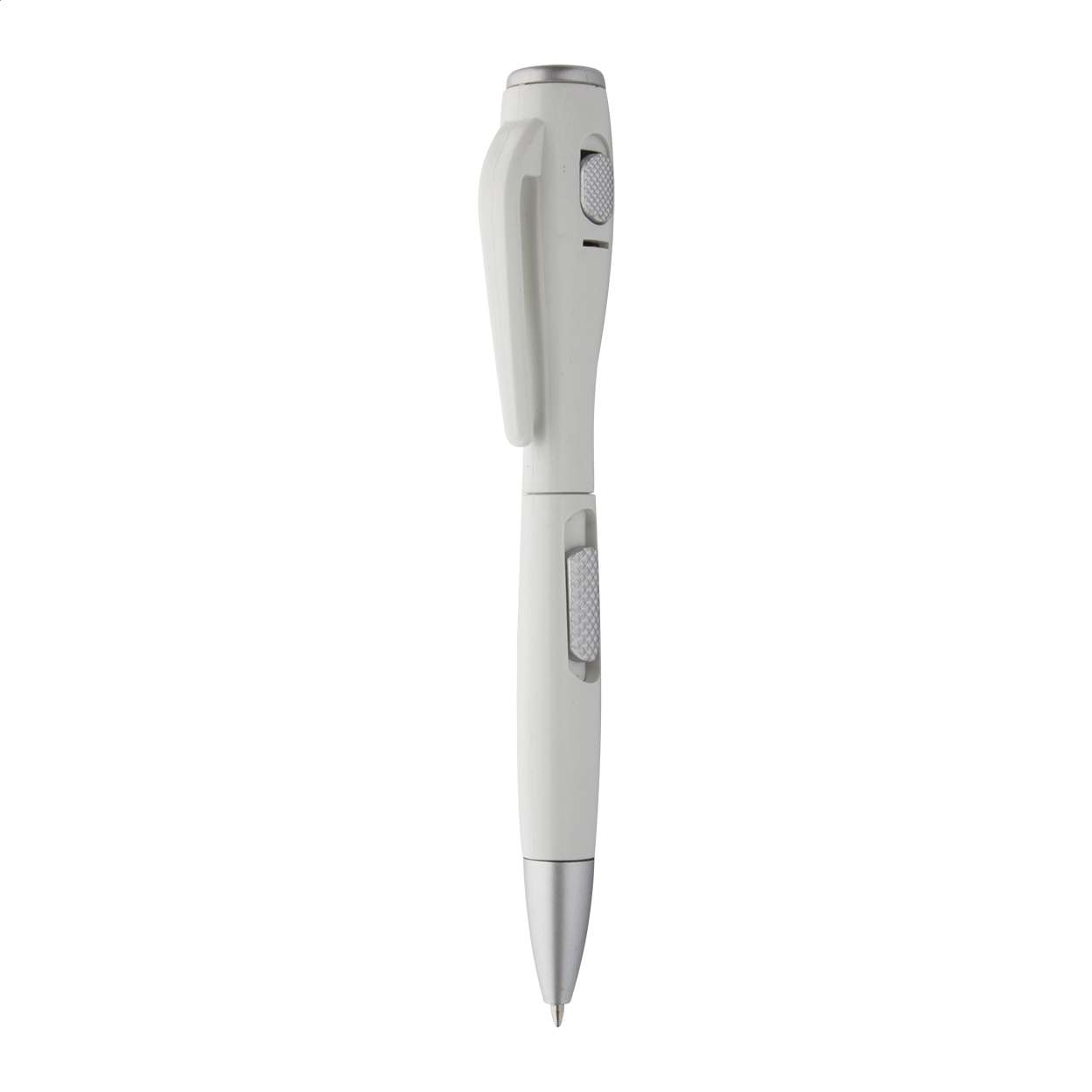 Penna a sfera con torcia ad 1 luce LED. Fornita con batteria a bottone e refill blu.