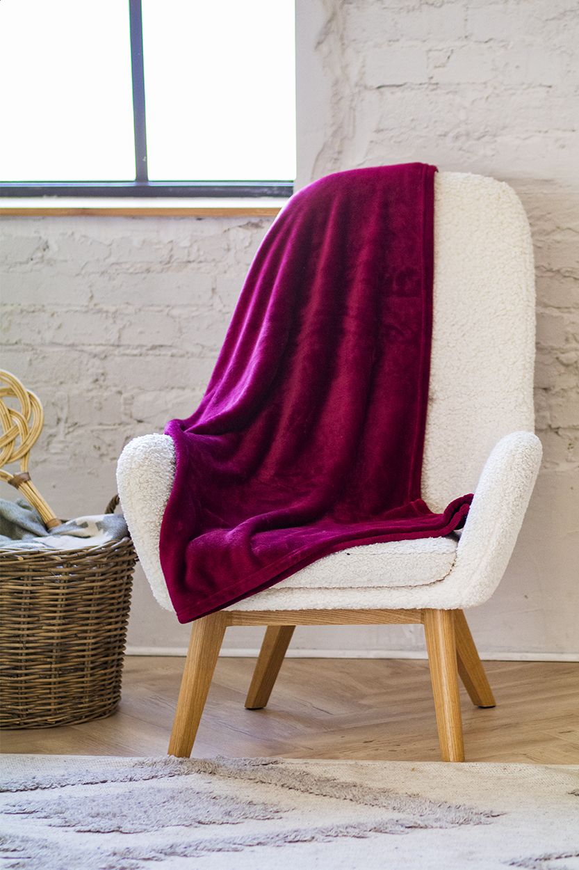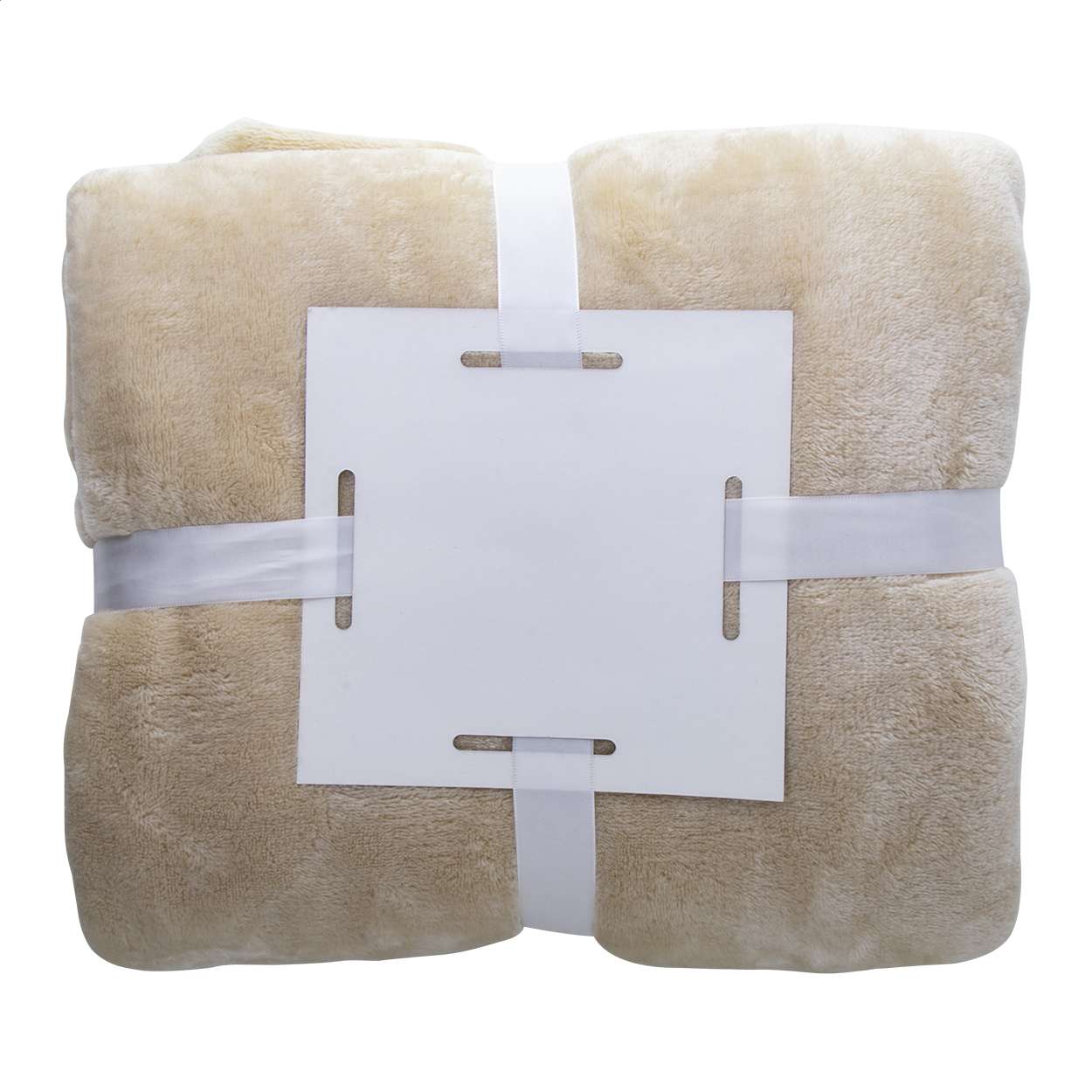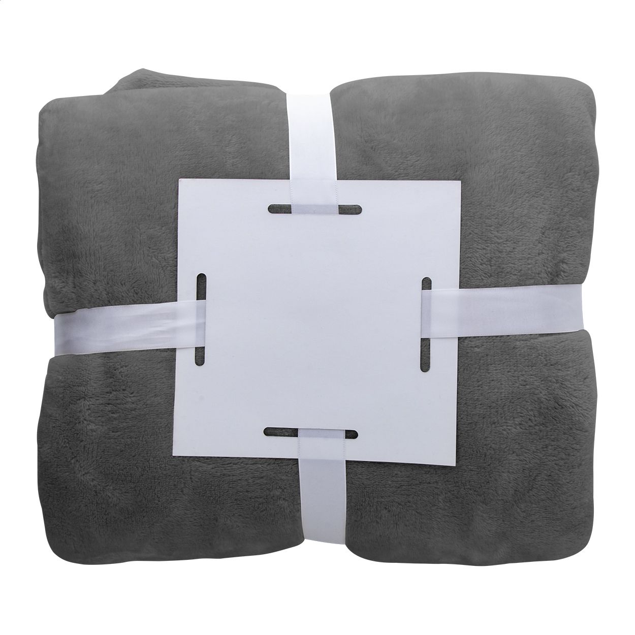 Coperta in pile di flanella, 280 gr/m². Confezionata con nastro bianco e cartoncino stampabile.