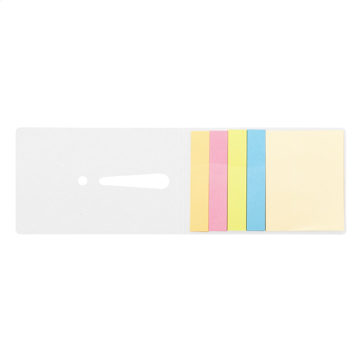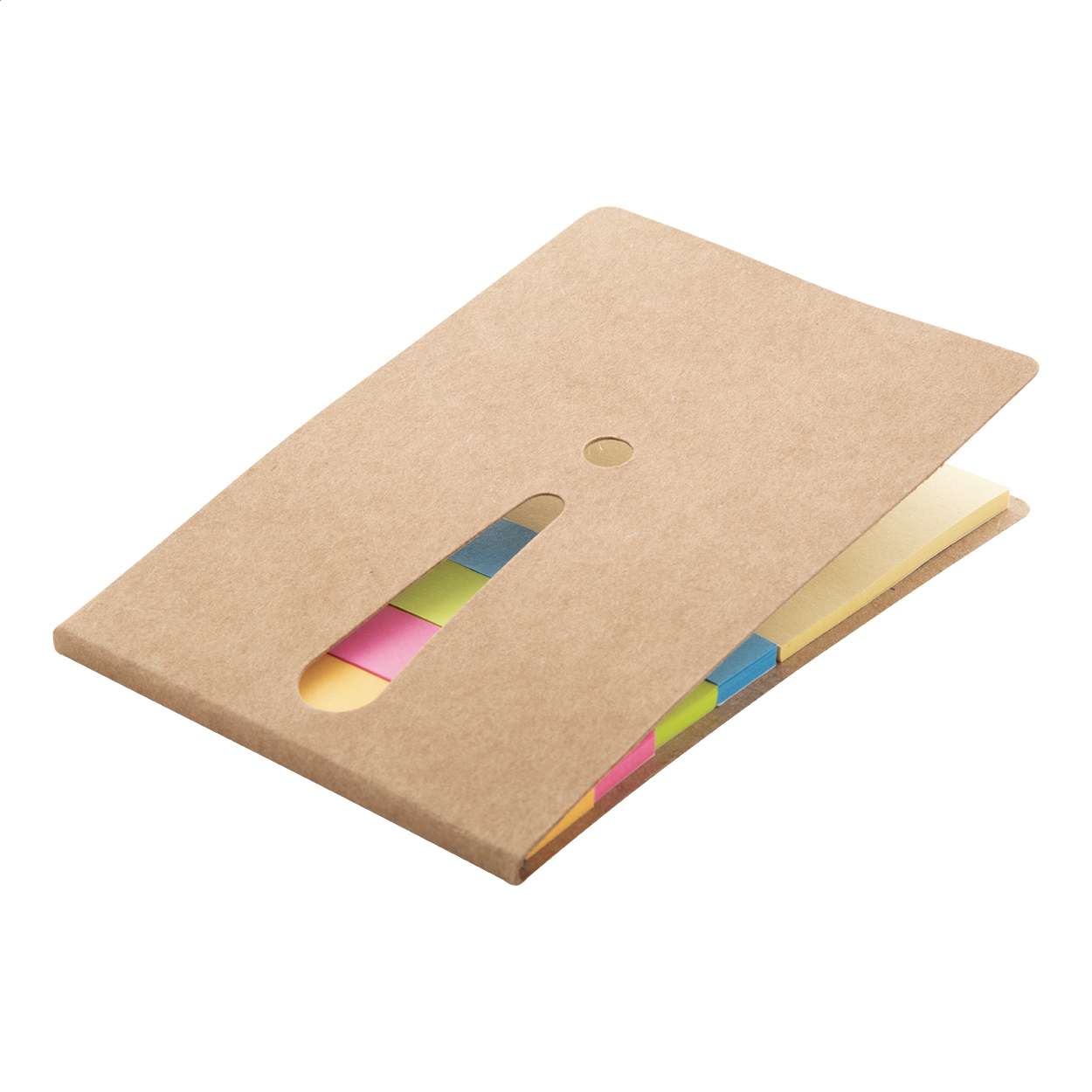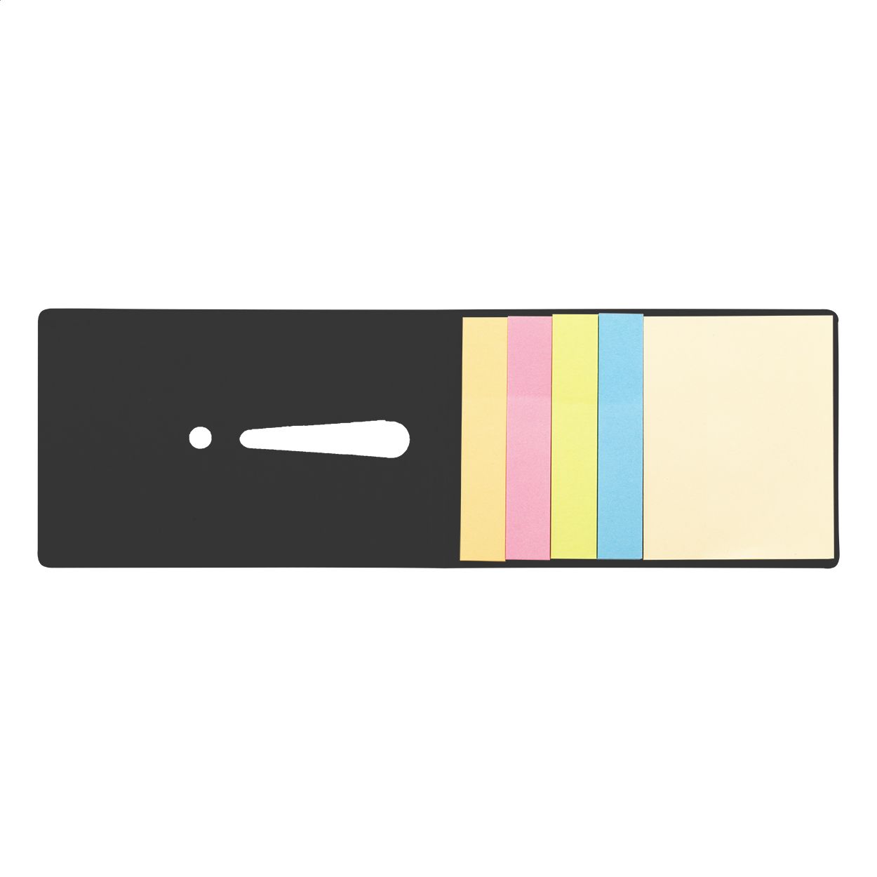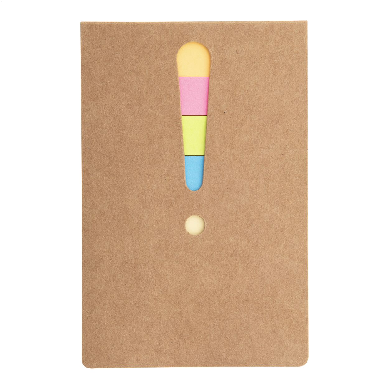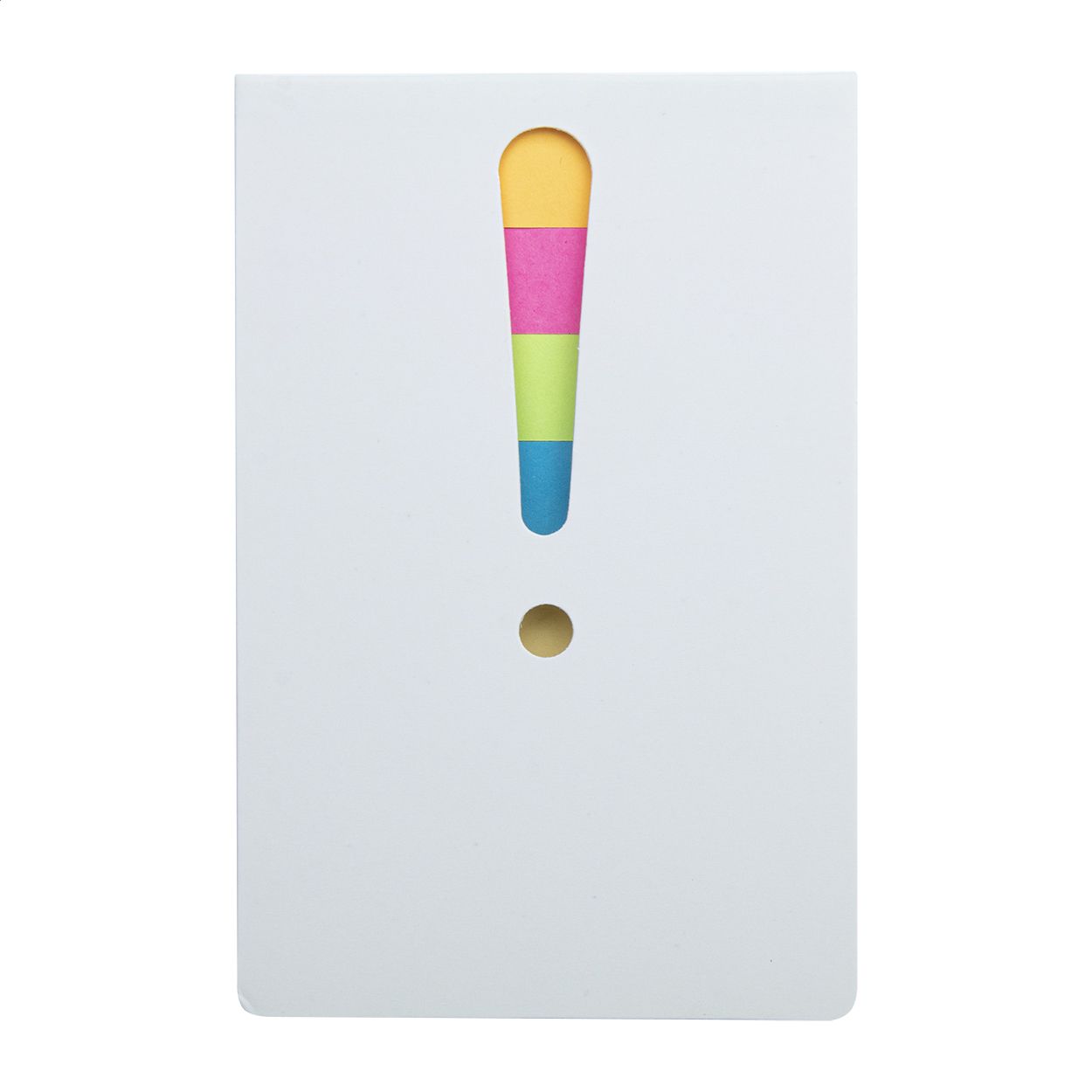 Blocco foglietti adesivi in due formati, 25 foglietti grandi e 100 piccoli (in 4 colori diversi). Con punto esclamativo fustellato sulla copertina.