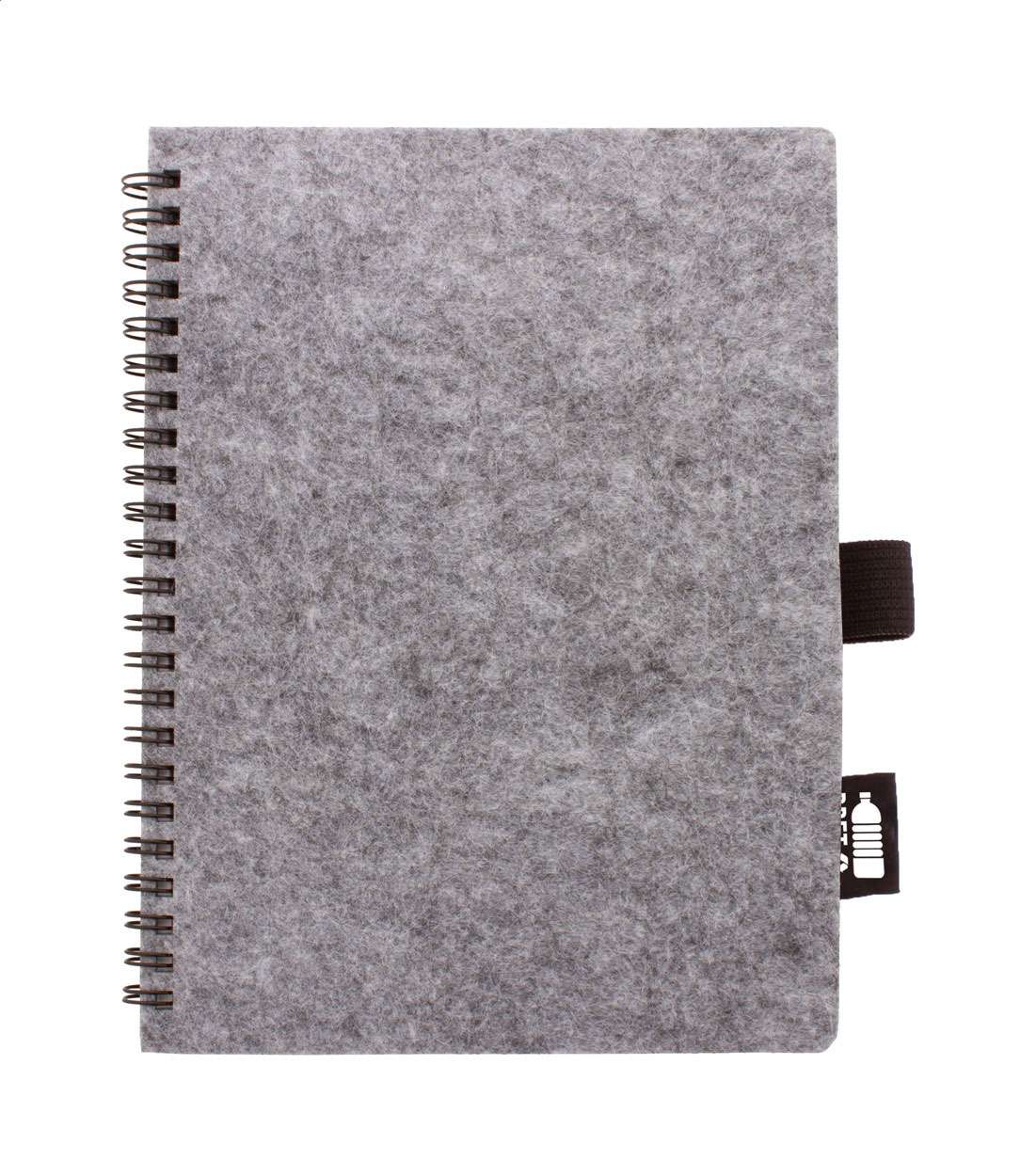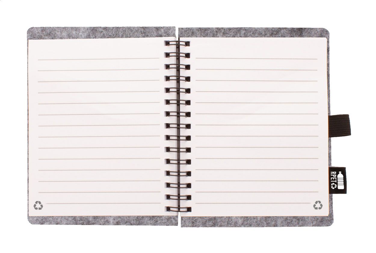 Quaderno a spirale formato A6, con copertina in feltro RPET, 80 fogli a righe in carta riciclata ed etichetta RPET.