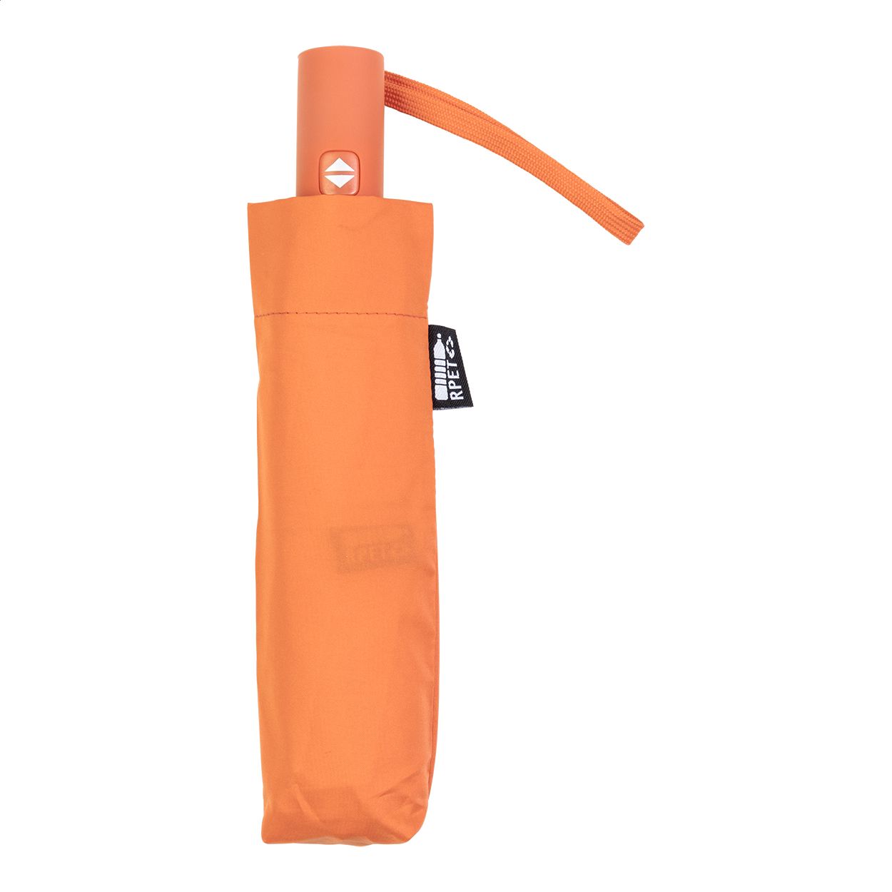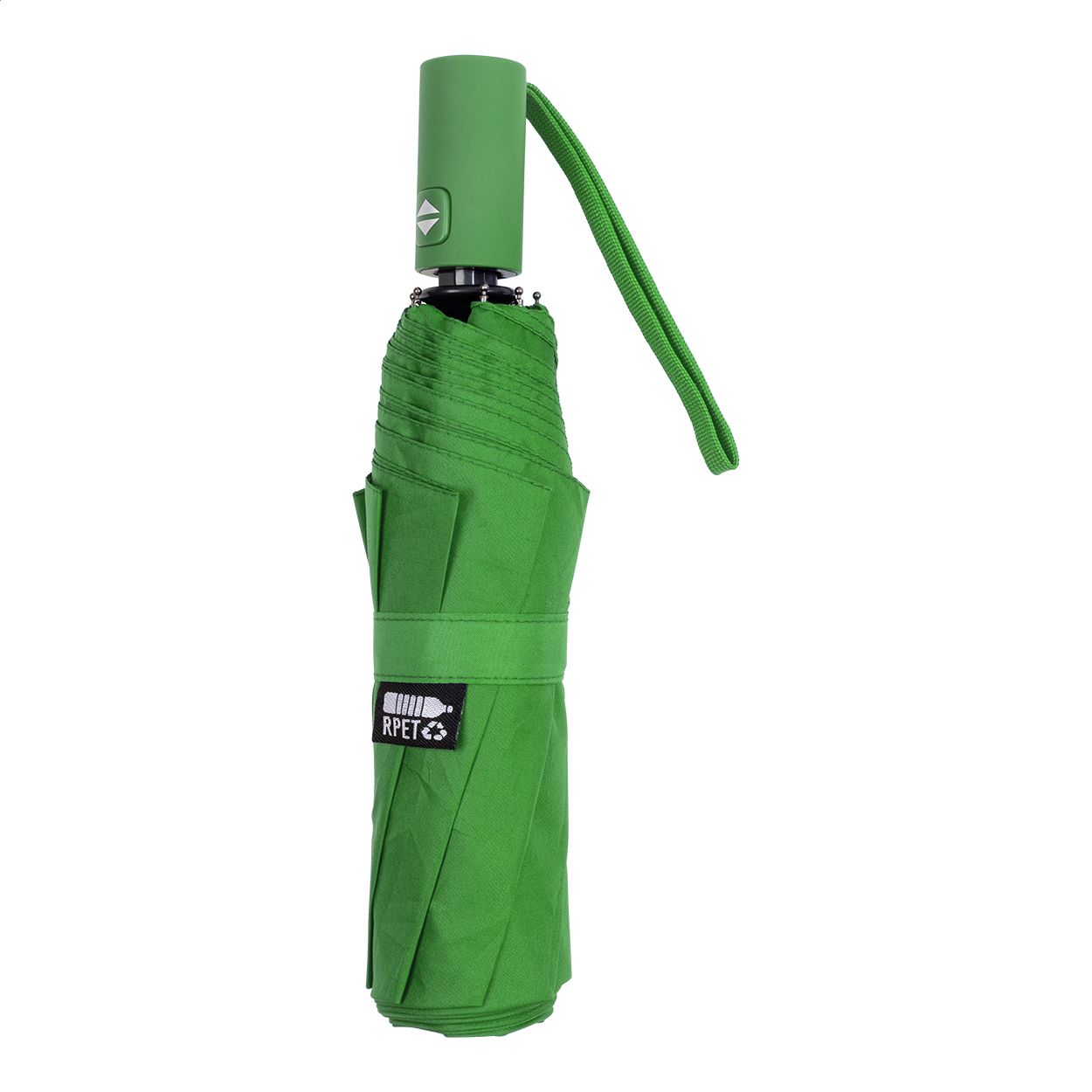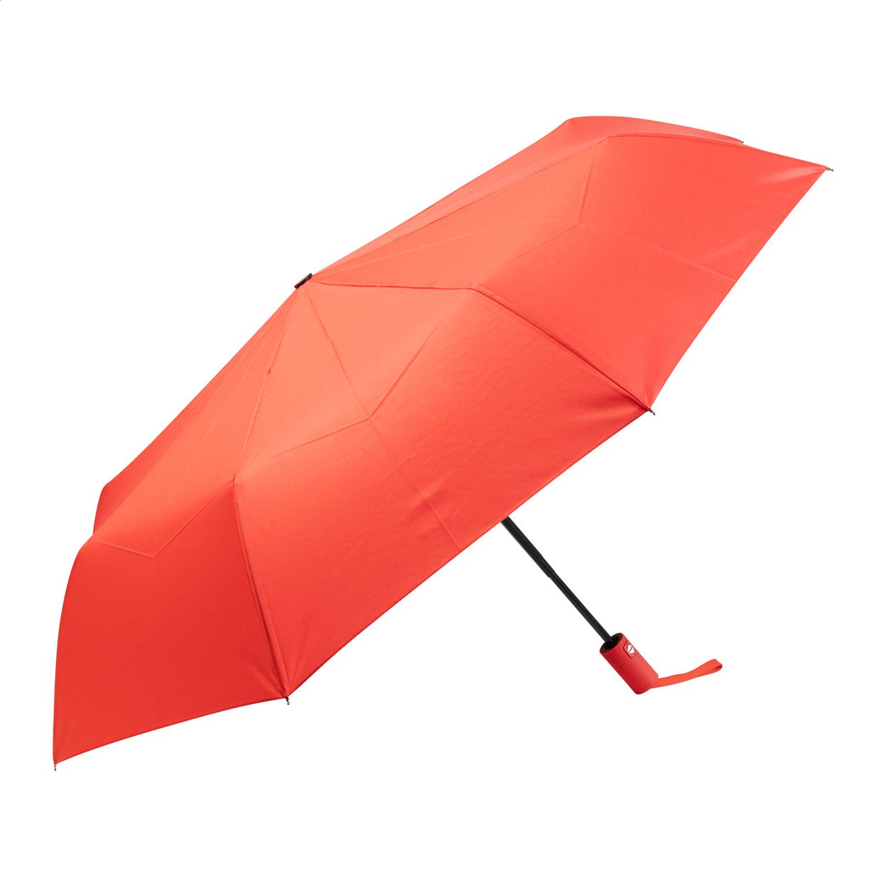 Ombrello pieghevole completamente automatico (apertura/chiusura) in pongee RPET 190T, antivento, con 8 pannelli e astuccio in colore coordinato. Struttura in metallo, stecche in fibra di vetro, manico gommato ed etichetta RPET.