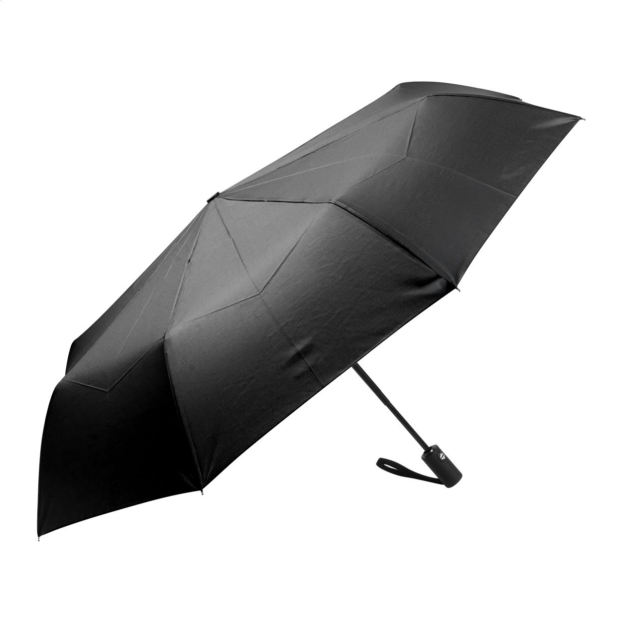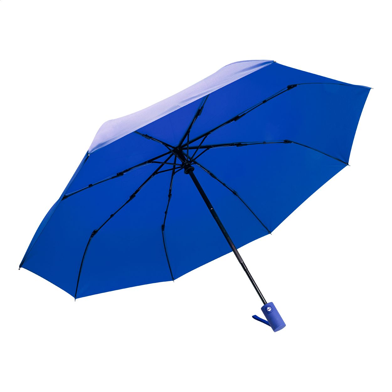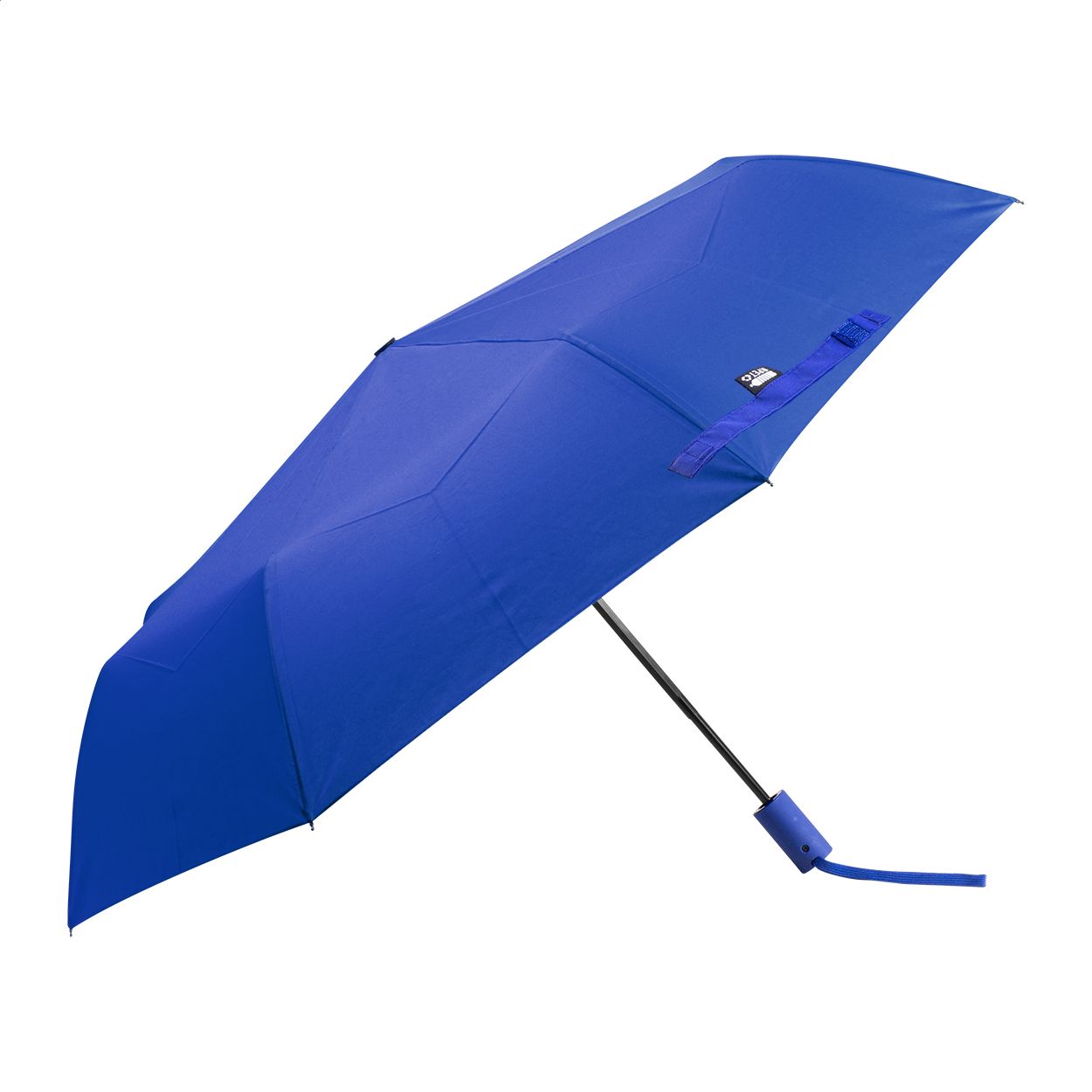 Ombrello pieghevole completamente automatico (apertura/chiusura) in pongee RPET 190T, antivento, con 8 pannelli e astuccio in colore coordinato. Struttura in metallo, stecche in fibra di vetro, manico gommato ed etichetta RPET.