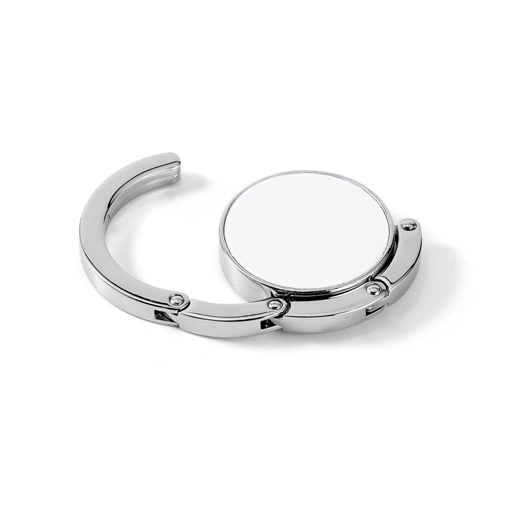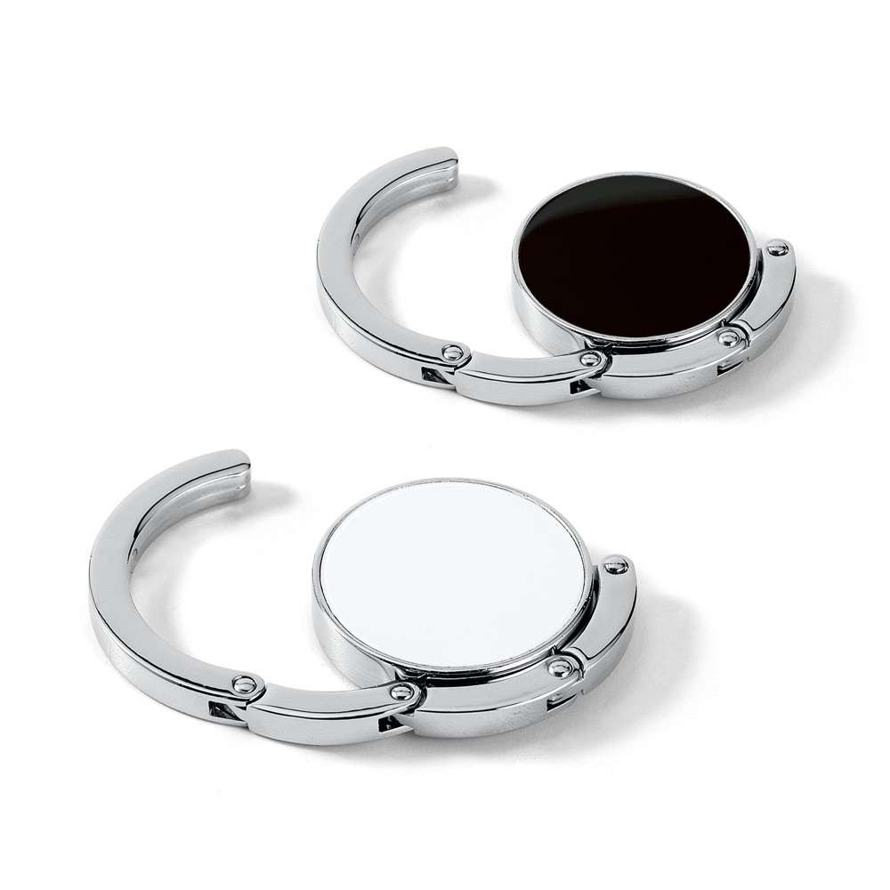 Supporto per borse in metallo. Il supporto può essere appoggiato su una superficie per appendere la borsa. Quando viene piegato rimane chiuso grazie ad una calamita. ø45 x 8 mm
