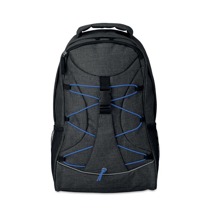Zaino in poliestere 600D con rivestimento colorato a contrasto. Cordino visibile al buio sul pannello frontale. Tasche a rete su entrambi i lati.