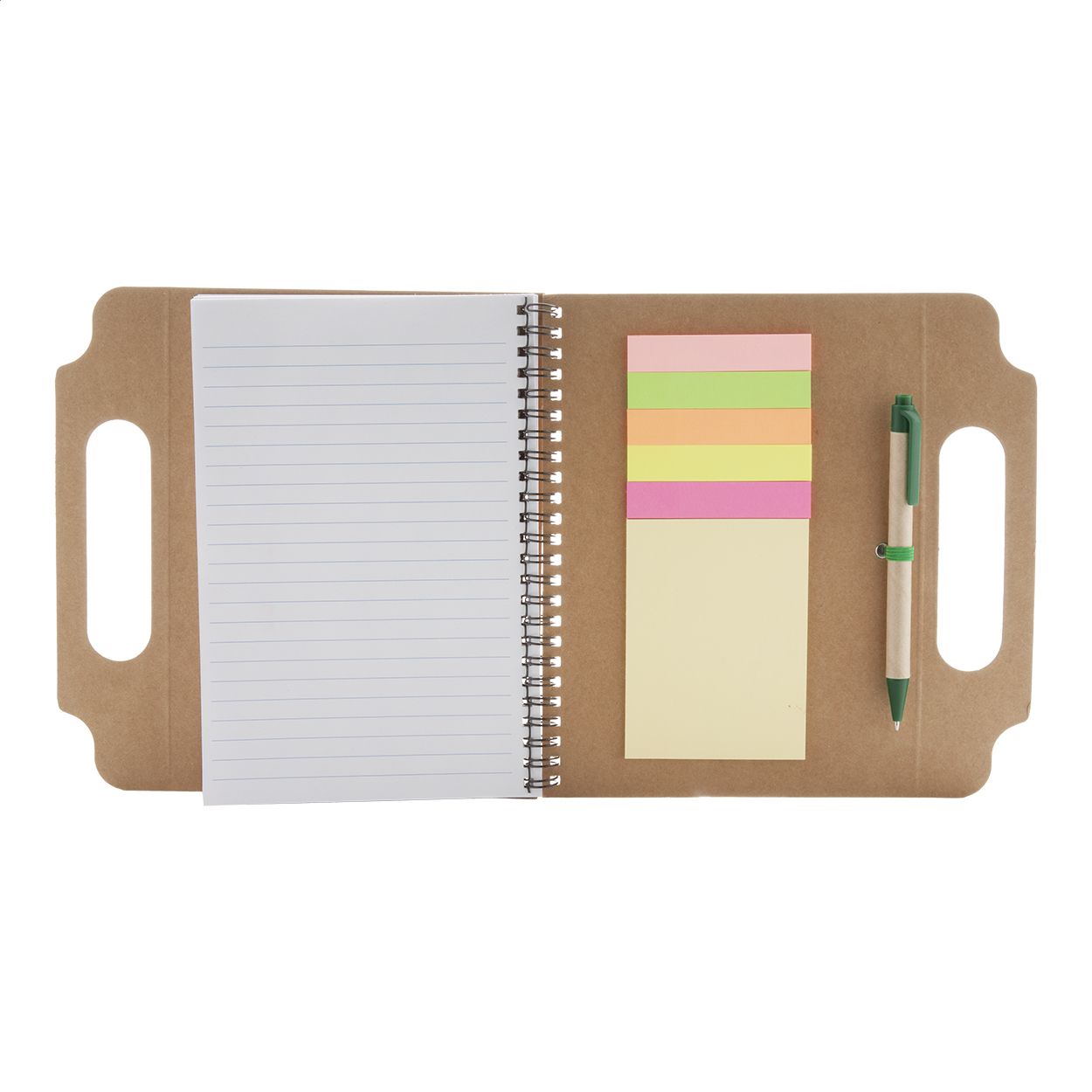 Quaderno a spirale in cartone riciclato con 70 fogli a righe, penna a sfera con refill blu e fogli adesivi (125pz piccoli e 25pz grandi).