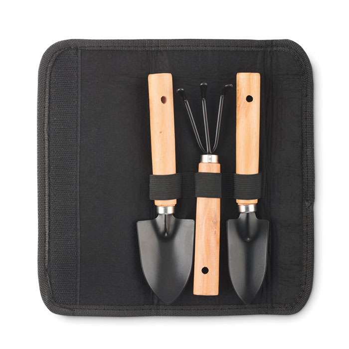 Set di 3 attrezzi da giardino. Rastrello e due palette. Presentati in una custodia in feltro RPET.