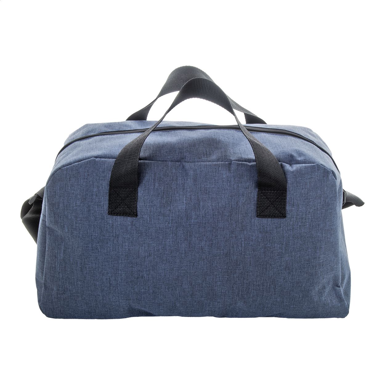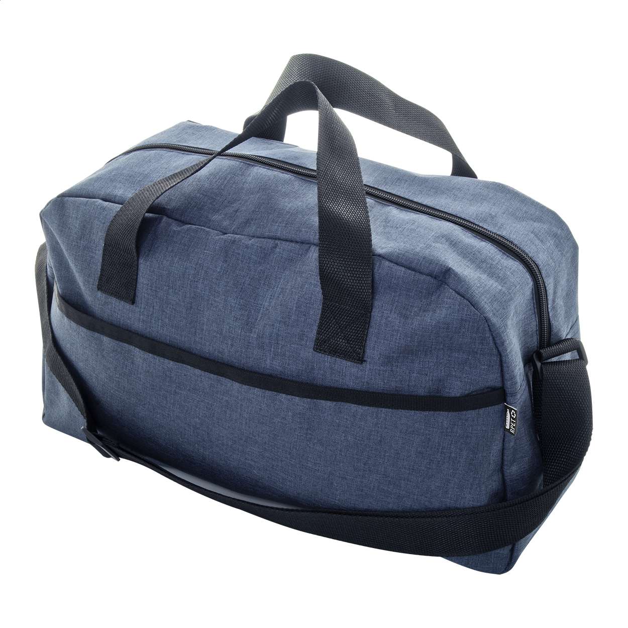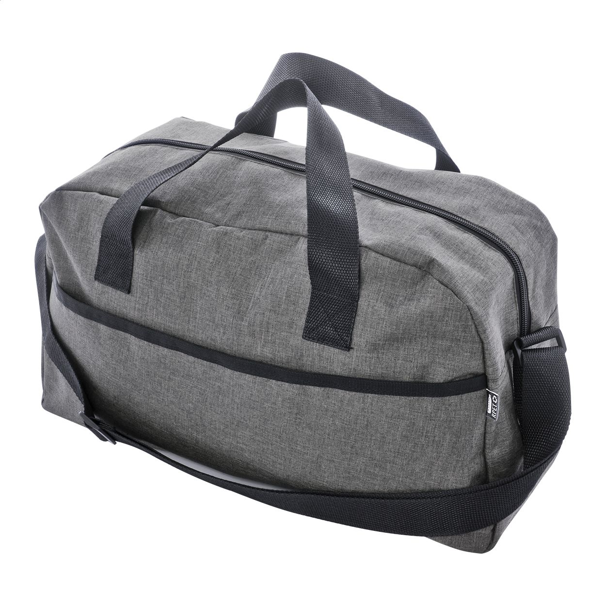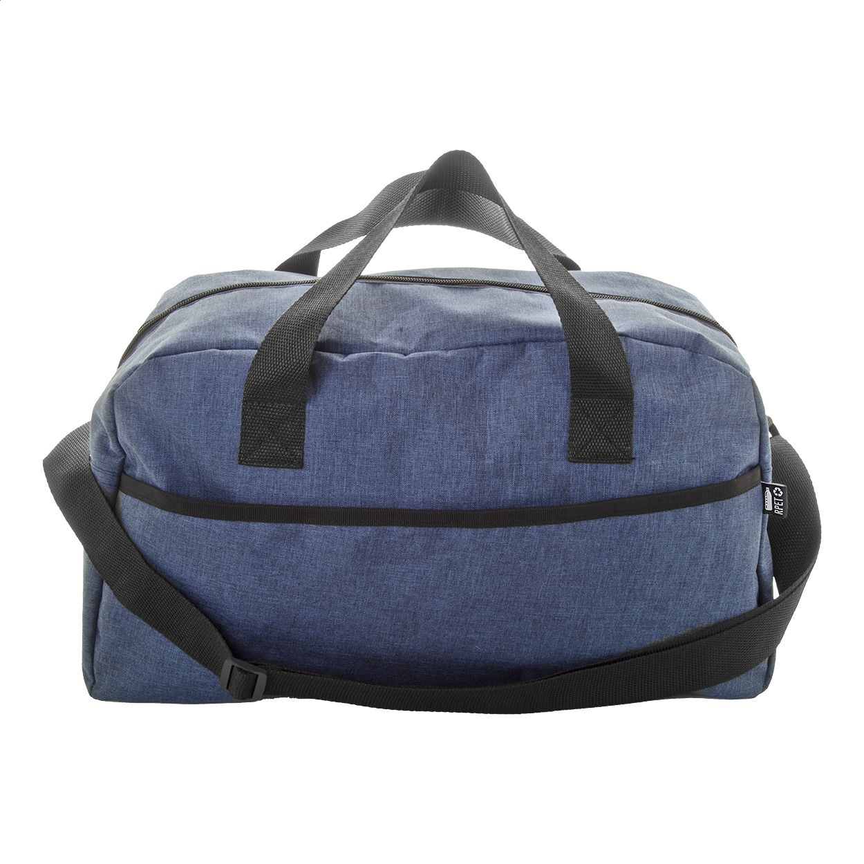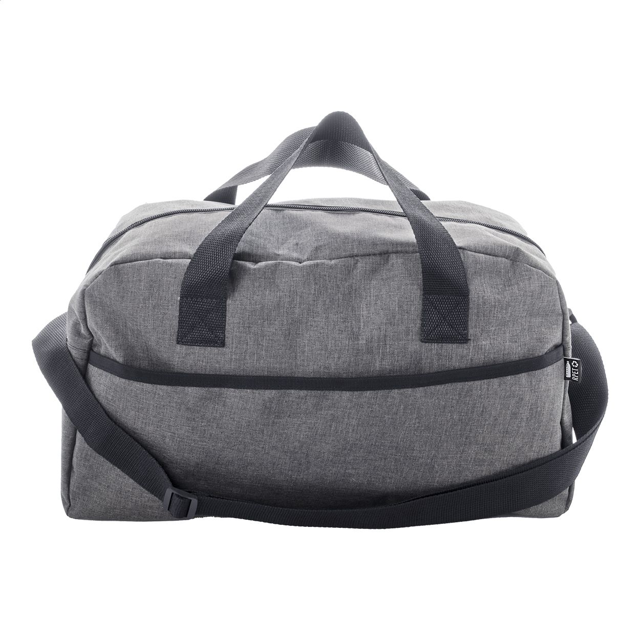 Borsa sportiva in poliestere 600D RPET con scomparto principale chiuso da cerniera, tasca frontale, tracolla regolabile ed etichetta RPET.