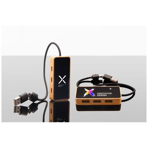 Hub USB 8 in 1 realizzato in bambù e PET riciclato provenienti da fonti responsabili, in grado di collegare fino a 6 dispositivi contemporaneamente con 3 porte USB-A e 3 porte di tipo C. Completamente compatibile con i computer moderni, è dotato di un logo LED personalizzabile e viene fornito in una confezione regalo in cartone riciclato, che unisce funzionalità e design. Velocità di trasferimento: USB/480 Mbps. Dimensione: 8 x 3,5 x 1,5 cm. Lunghezza del cavo: 24 cm.