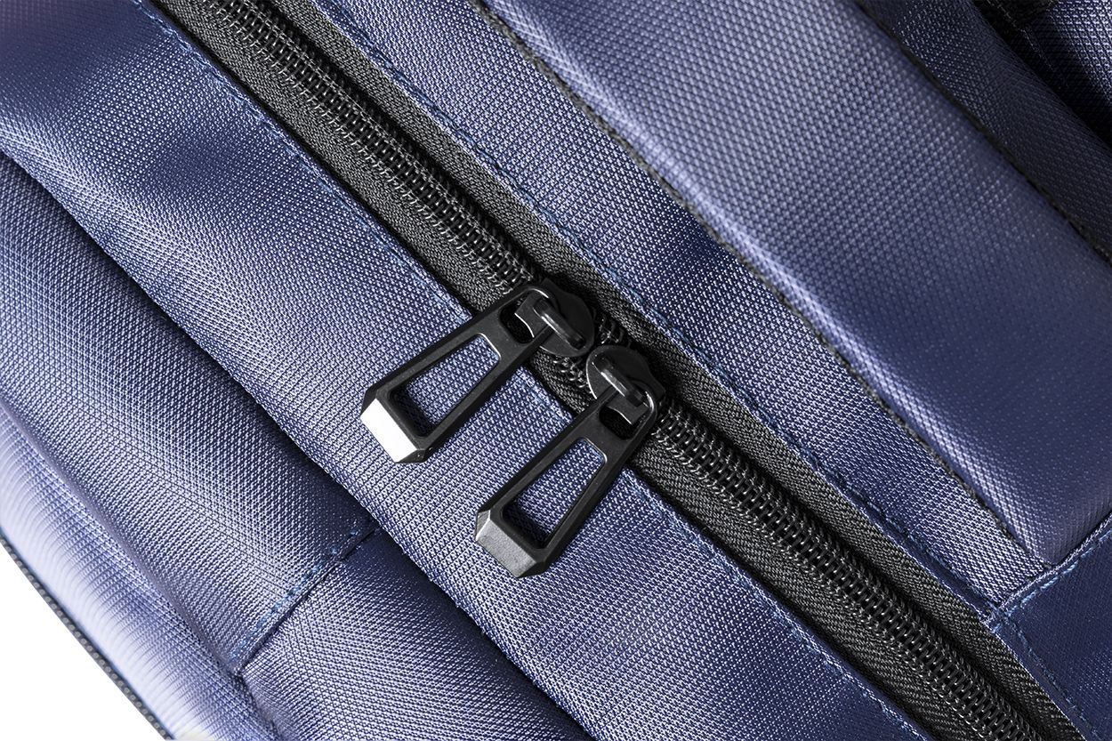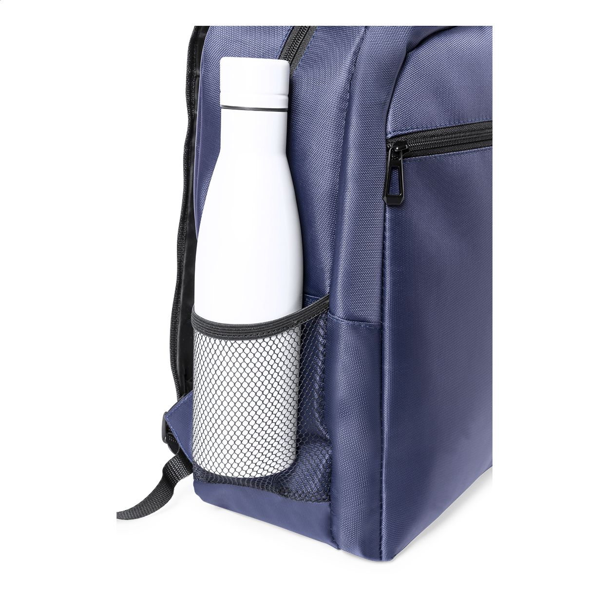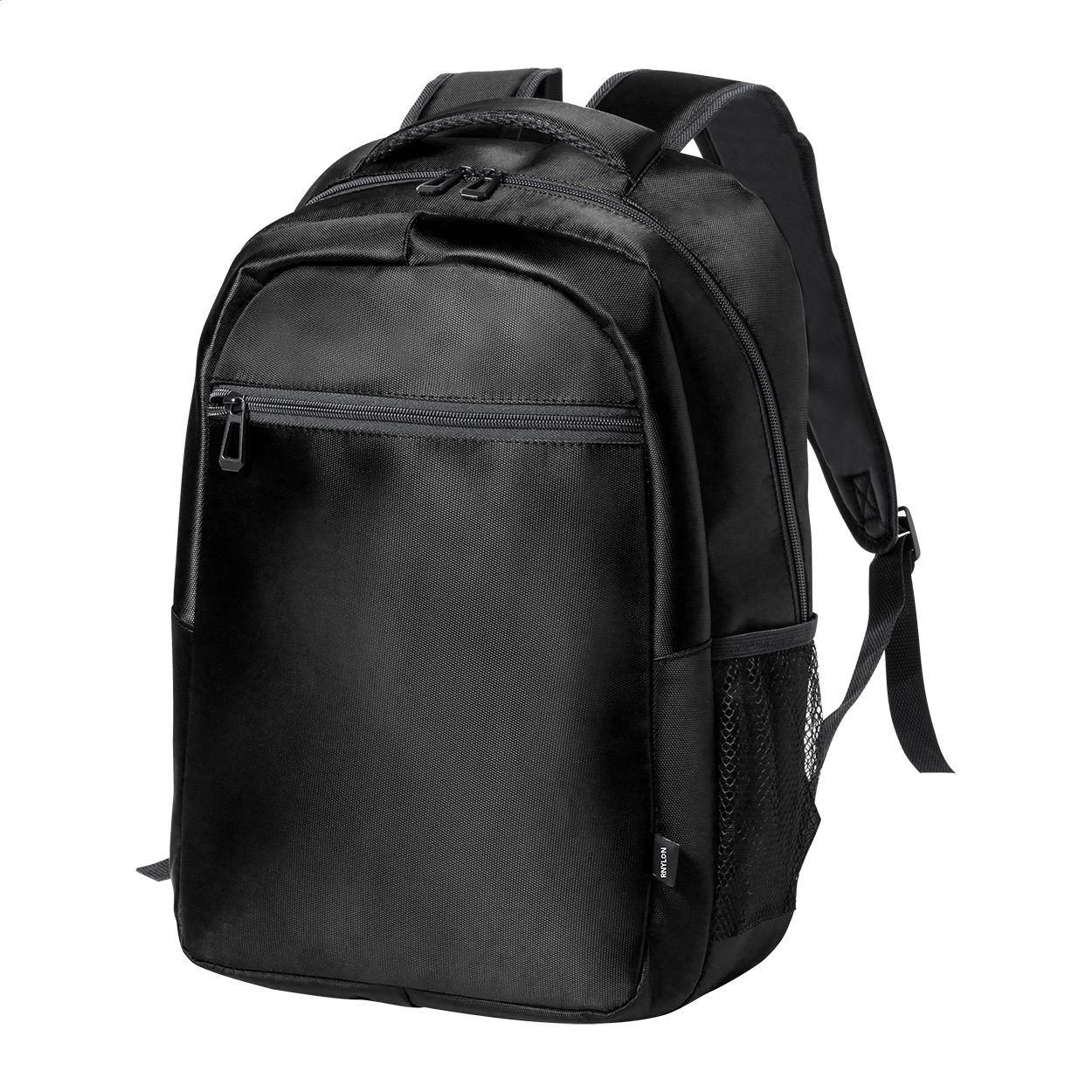 Zaino RNYLON con scomparti chiusi da cerniera, tasche laterali in rete, tasca imbottita per laptop (15"), cinghia trolley, schienale e spallacci imbottiti. In nylon riciclato 420D ed etichetta RNYLON.