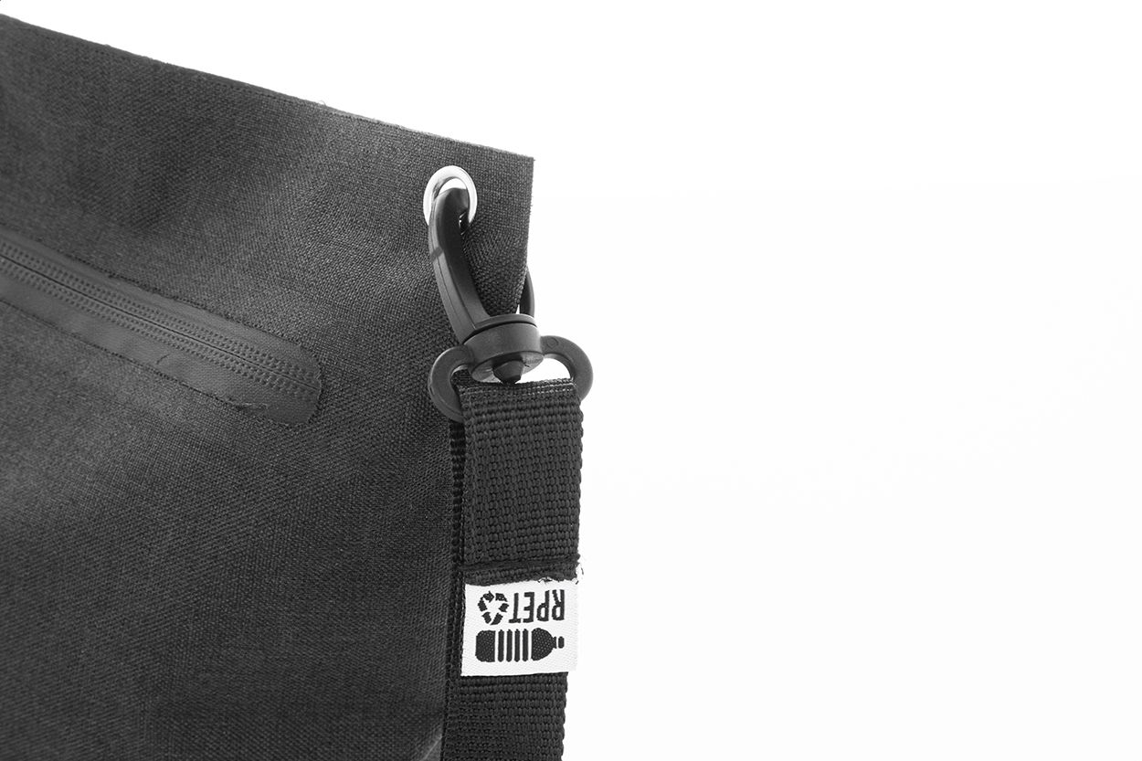 Trousse impermeabile in poliestere 300D RPET per cosmetici, con cerniera, cinturino con moschettone ed etichetta RPET.