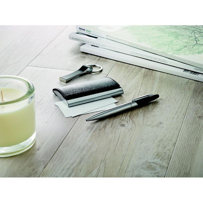 Set business in confezione regalo nera composto da: 1 penna a sfera (refill nero), 1 portachiavi in PU e lega di zinco e 1portabiglietti da visita.