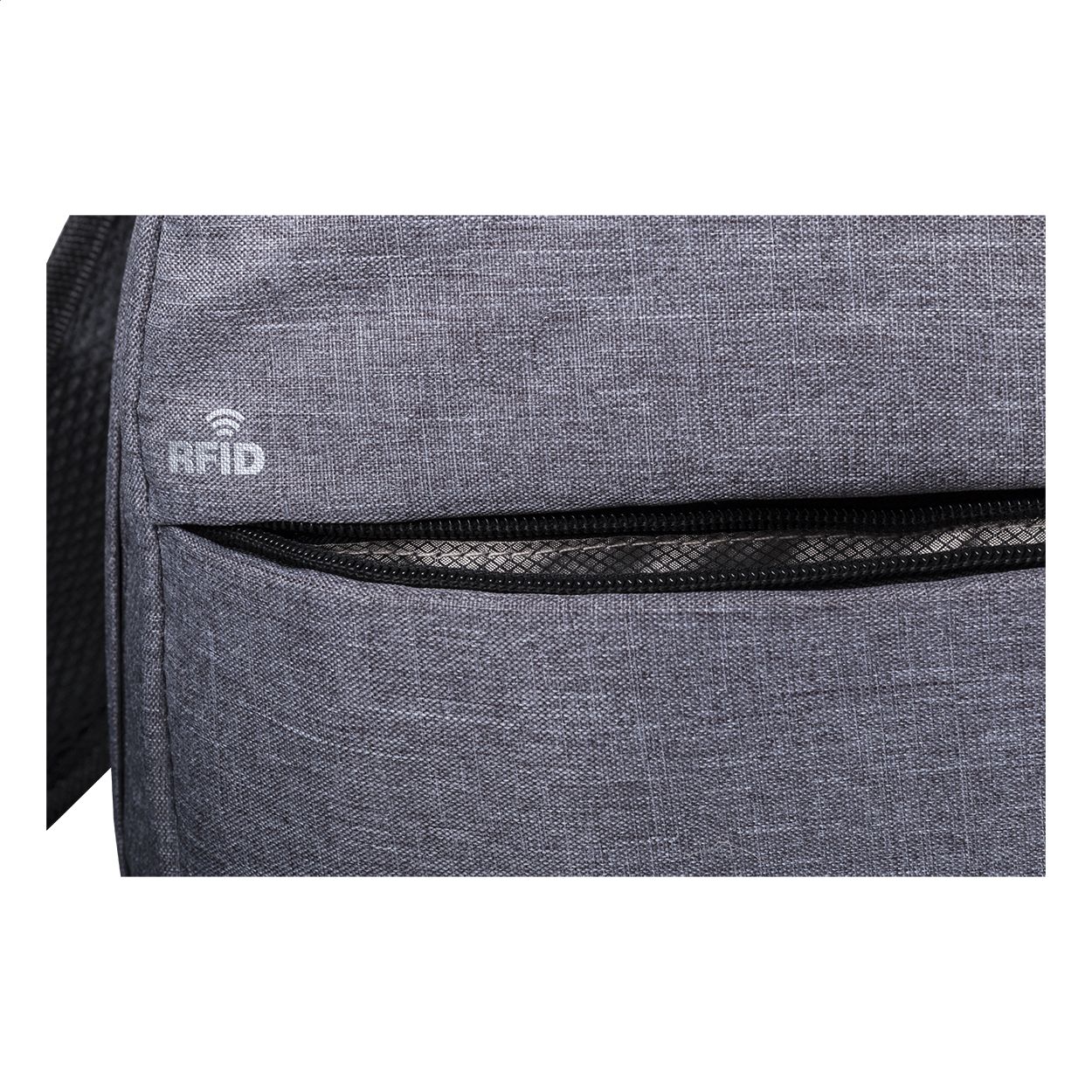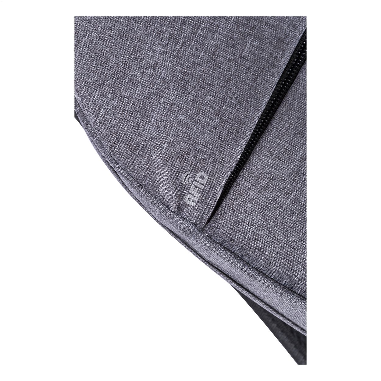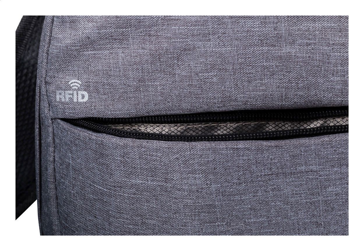 Zaino con protezione RFID, scomparti multipli con zip, scomparto imbottito per computer portatile (15"), schienale imbottito e tracolla. Con connettore USB integrato per power bank. Poliestere 300D.