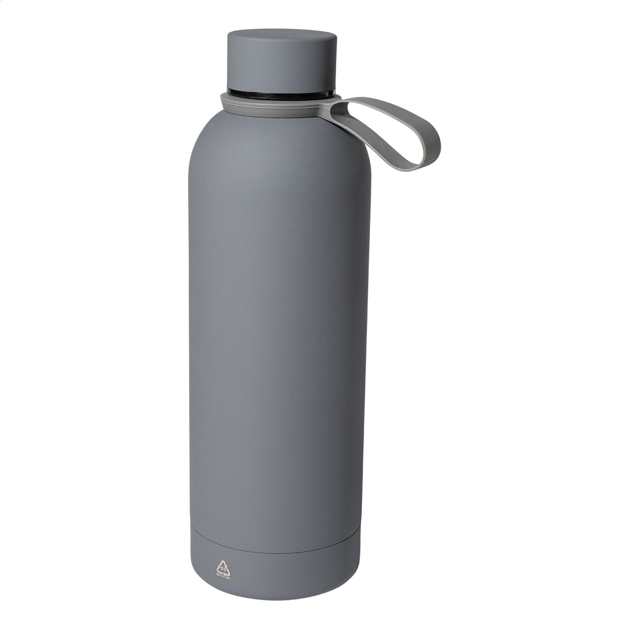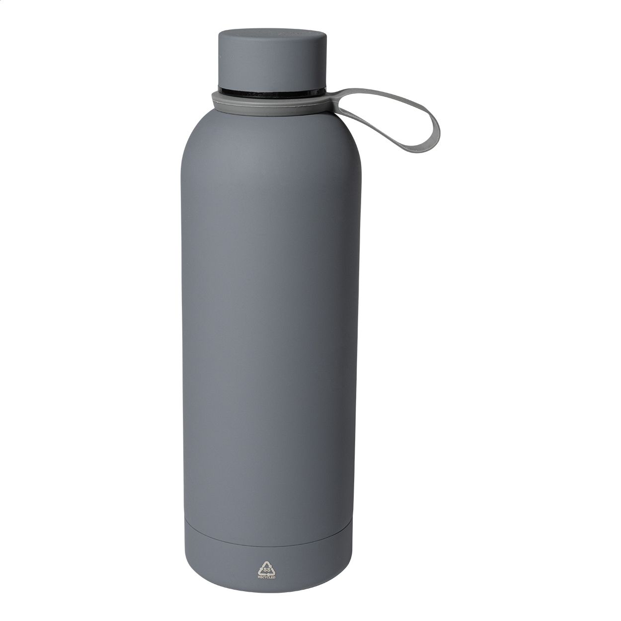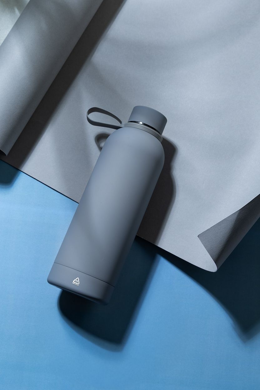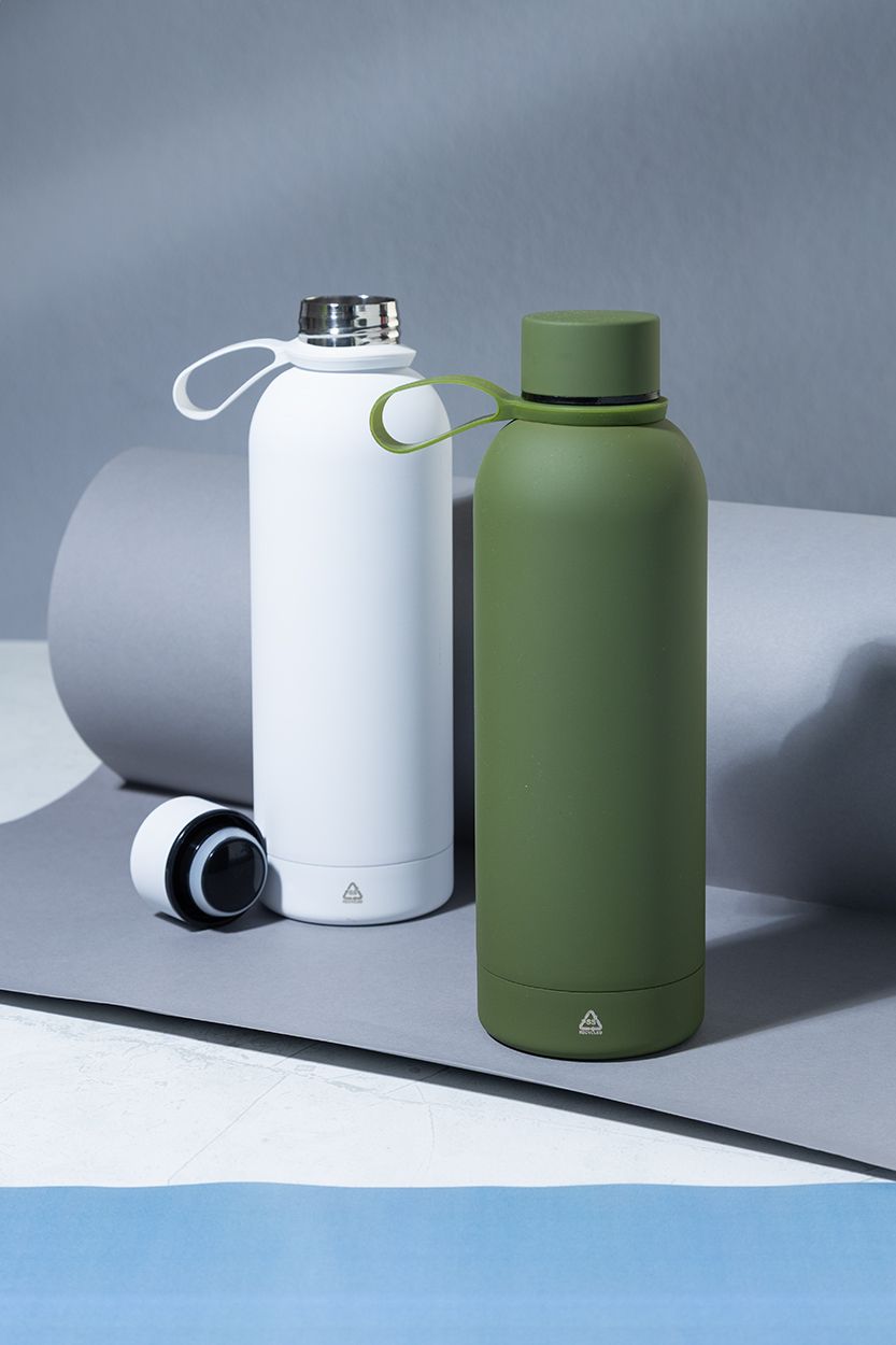 Borraccia termica in acciaio riciclato a doppia parete da 500ml con finitura gommata e cinghia in silicone.