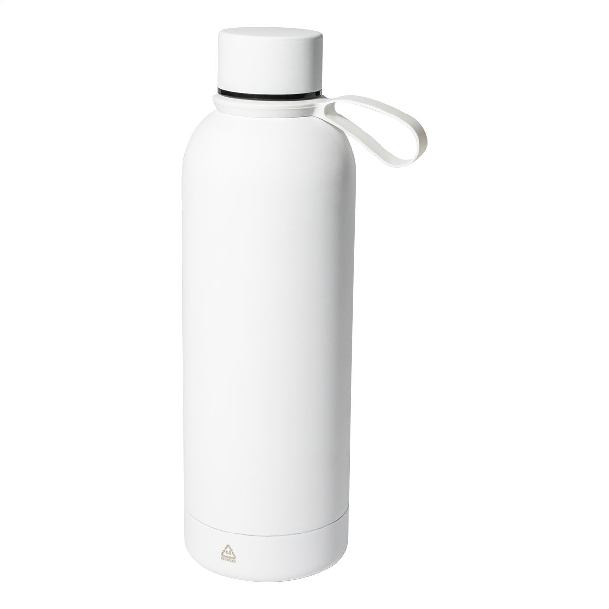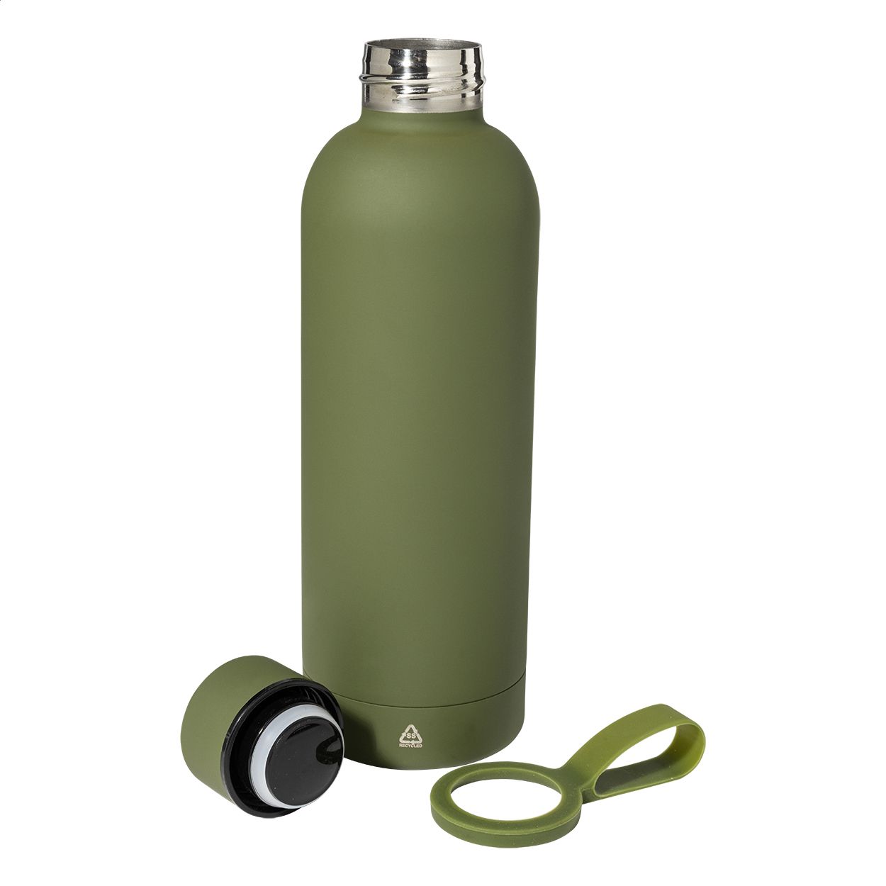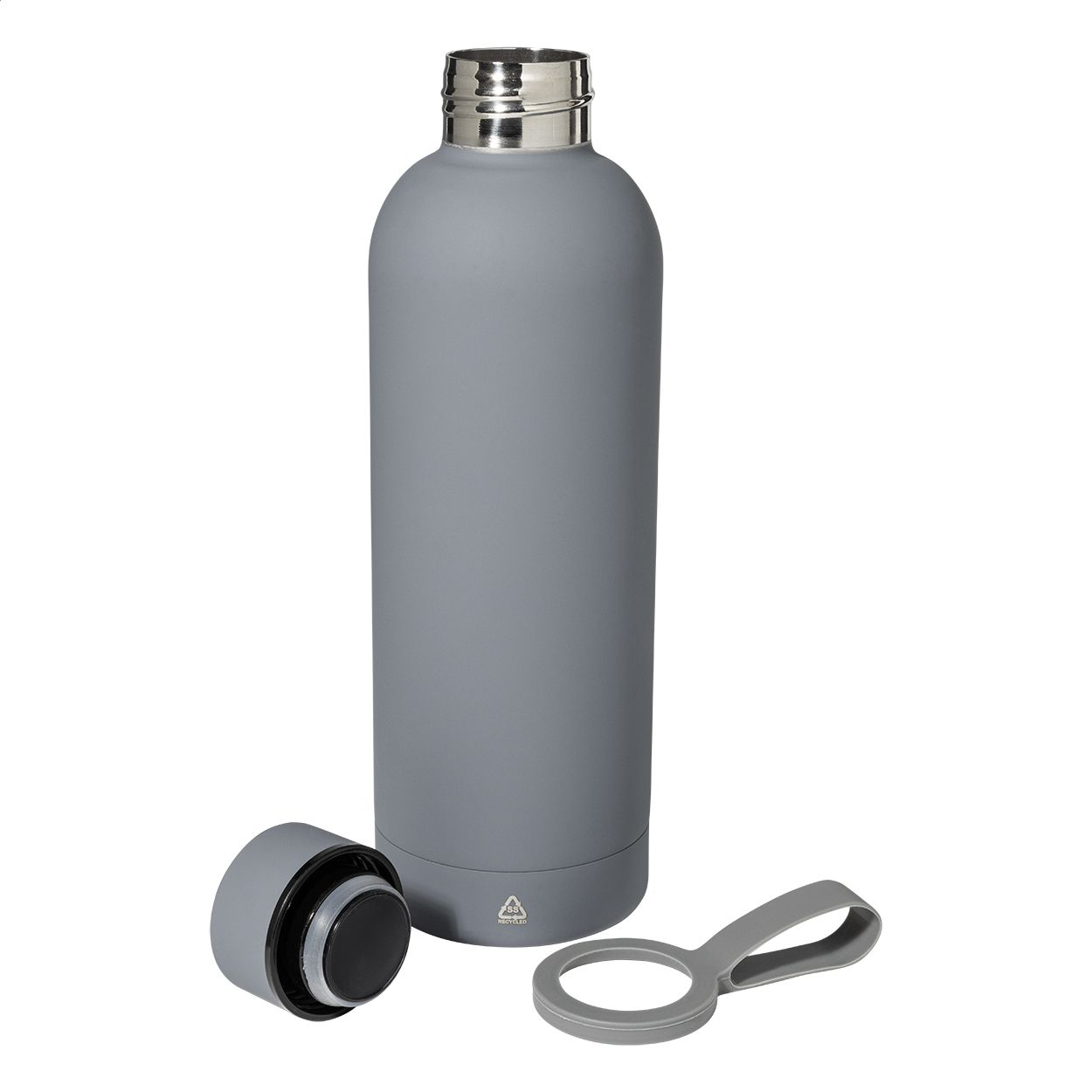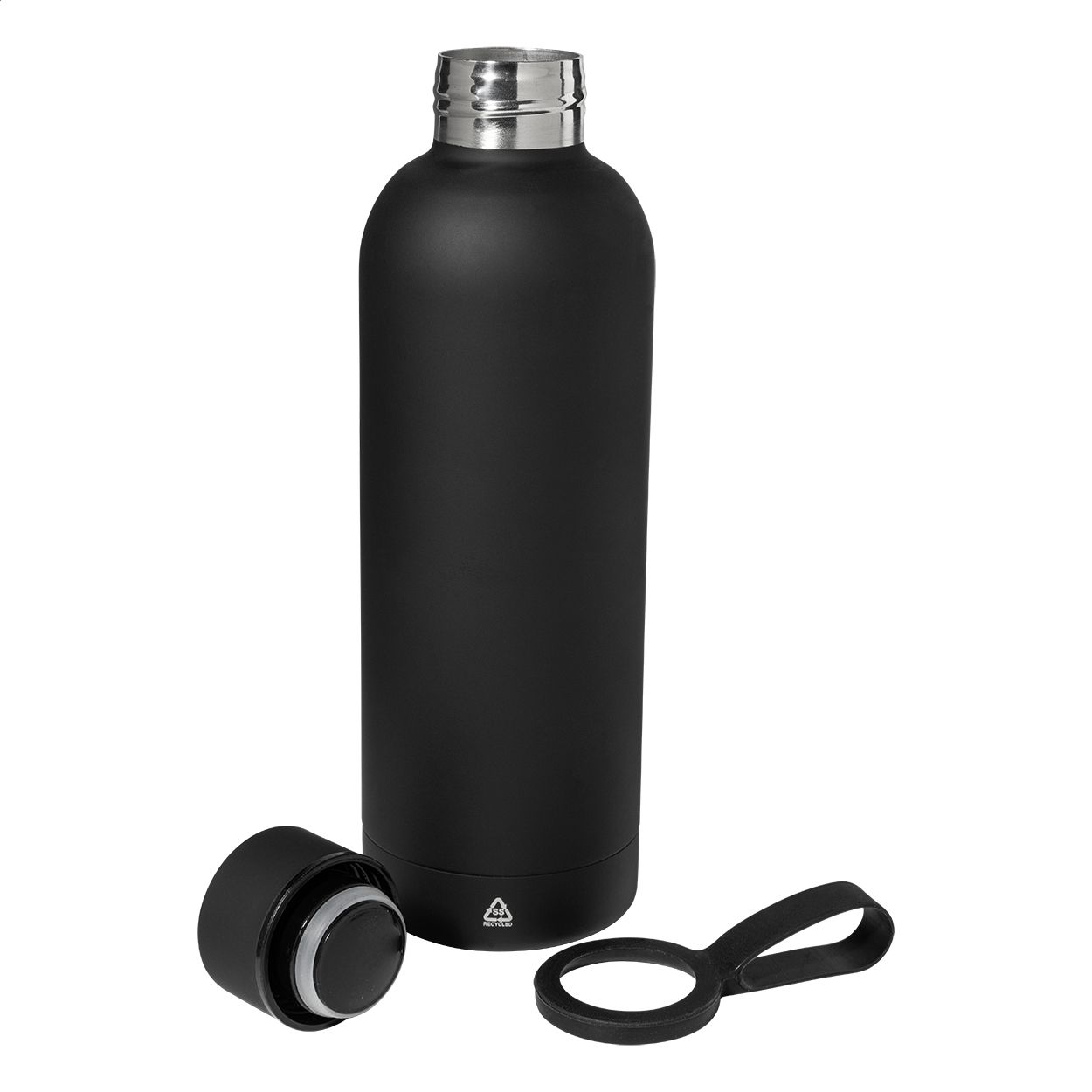 Borraccia termica in acciaio riciclato a doppia parete da 500ml con finitura gommata e cinghia in silicone.