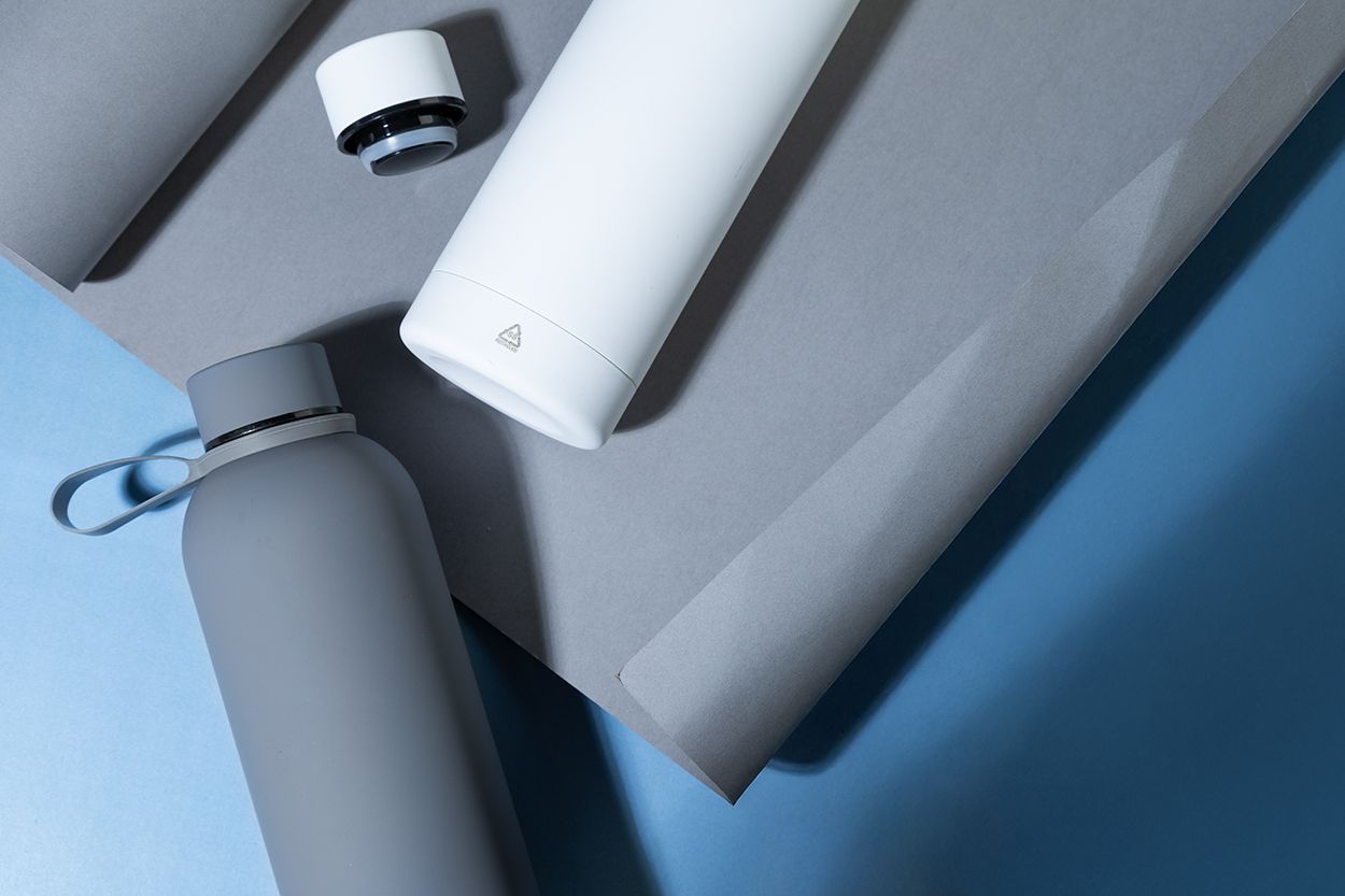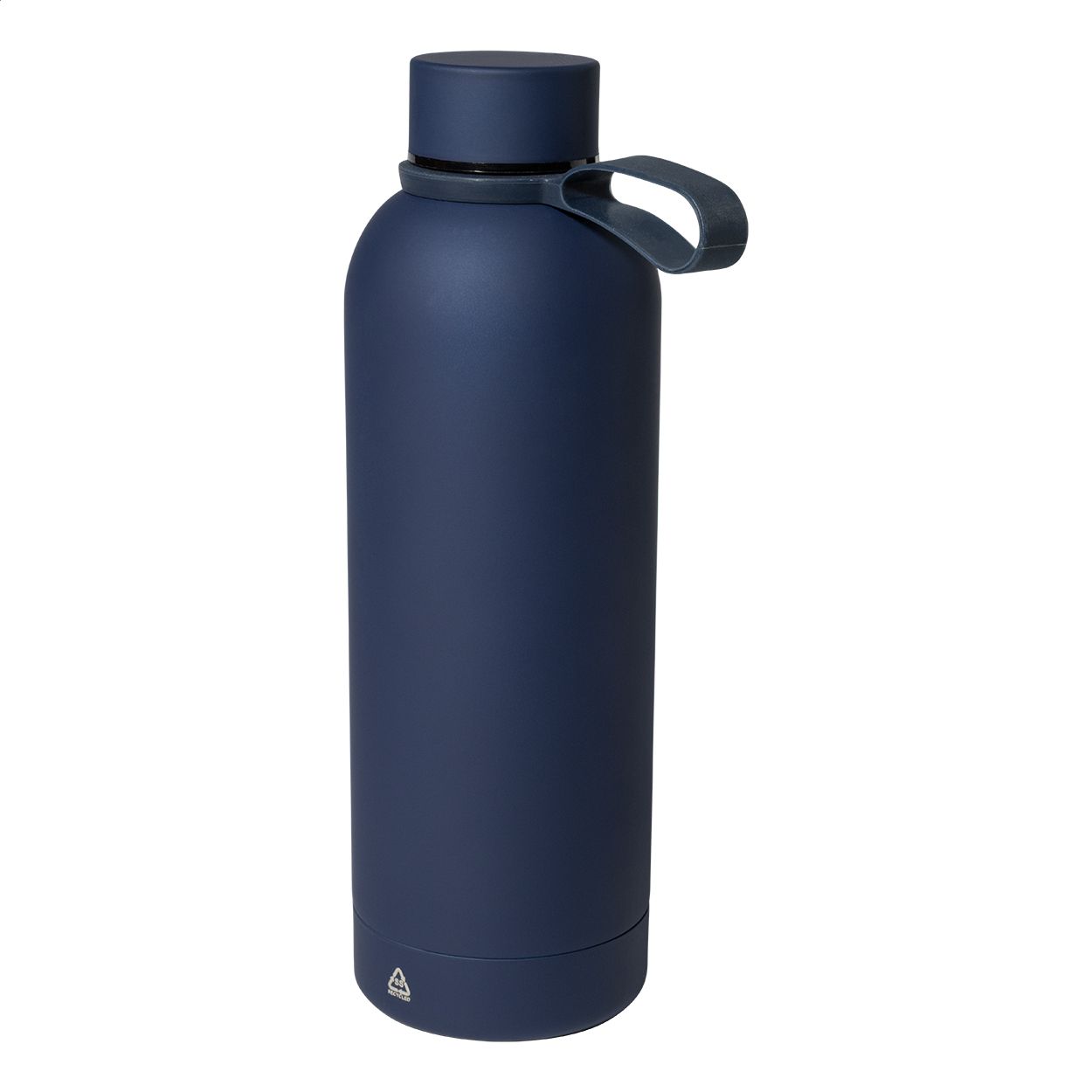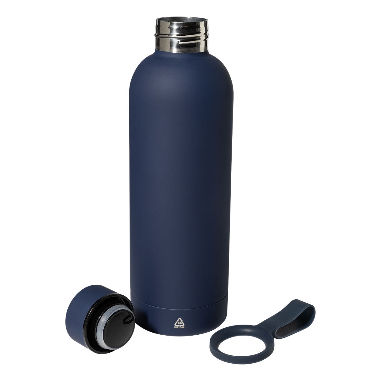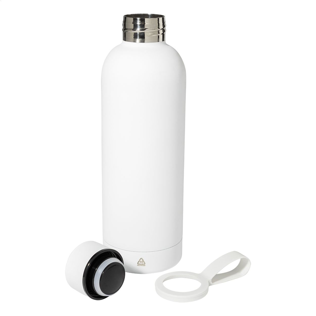 Borraccia termica in acciaio riciclato a doppia parete da 500ml con finitura gommata e cinghia in silicone.
