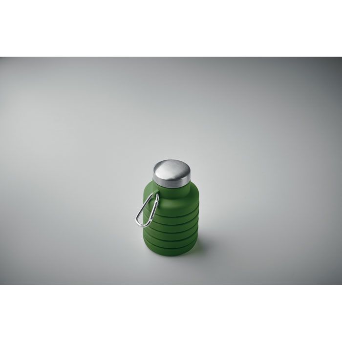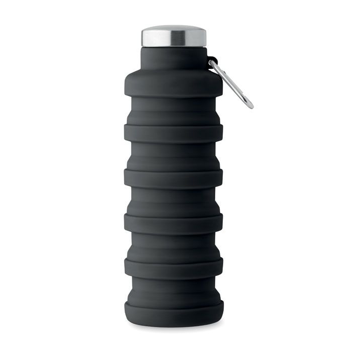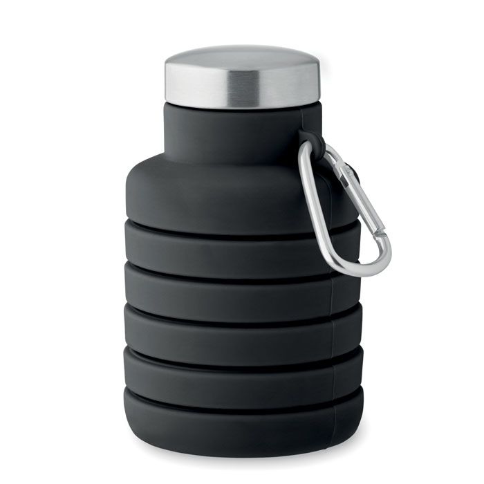 Bottiglia pieghevole in silicone con coperchio in acciaio inox e moschettone in alluminio. Il moschettone non è adatto all'arrampicata (uso non professionale). Capacità: 500 ml.