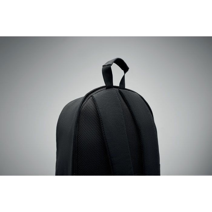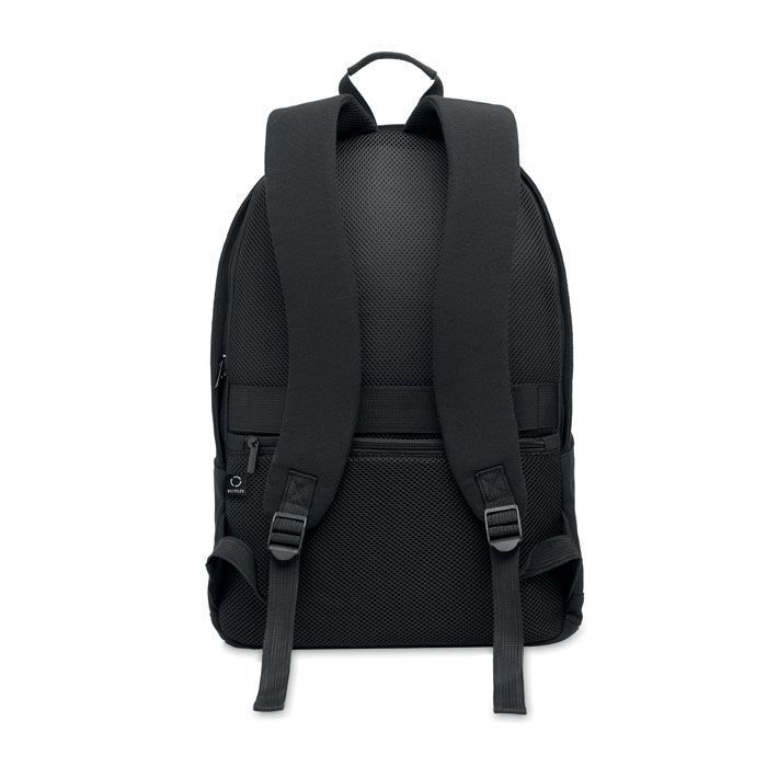 Zaino per laptop da 15 pollici in cotone riciclato e poliestere riciclato (70%/30%). Ha una tasca frontale con cerniera e una tasca con cerniera sul lato posteriore. Schienale e spallacci imbottiti. Custodia per valigia.