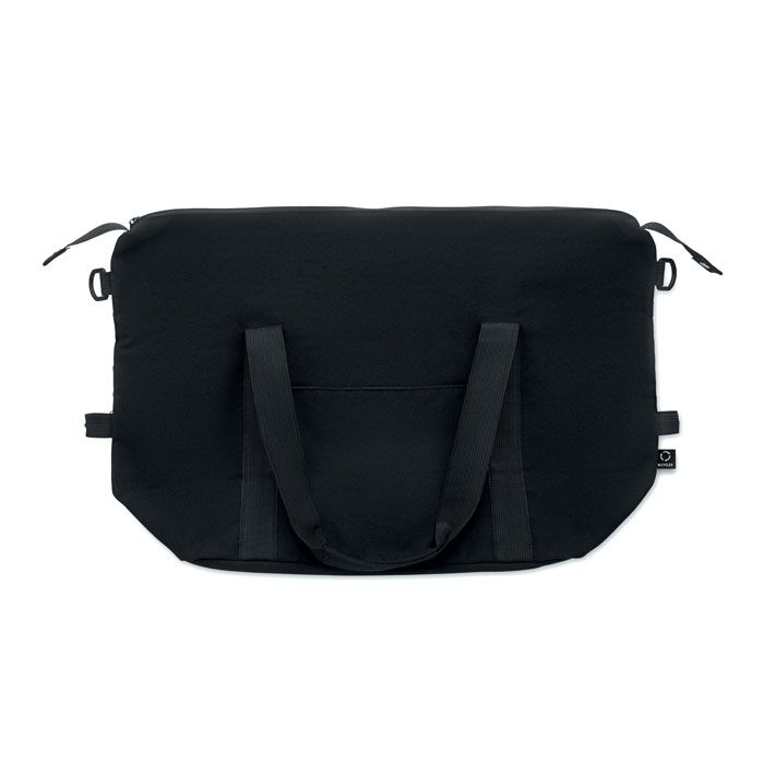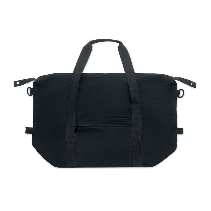 Borsa da weekend in cotone riciclato e poliestere riciclato (70%/30%) con fodera in poliestere 210D RPET. Con tasca frontale, tasca posteriore con cerniera, di una tracolla rimovibile e regolabile e di un fondo imbottito. Custodia per valigia.