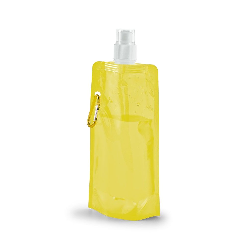 Bottiglia pieghevole in PE con beccuccio push-pull. Coperchio trasparente e moschettone. Capacità fino a 460 mL. 120 x 260 x 30 mm