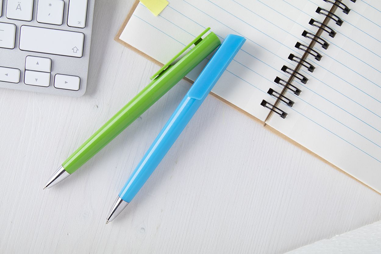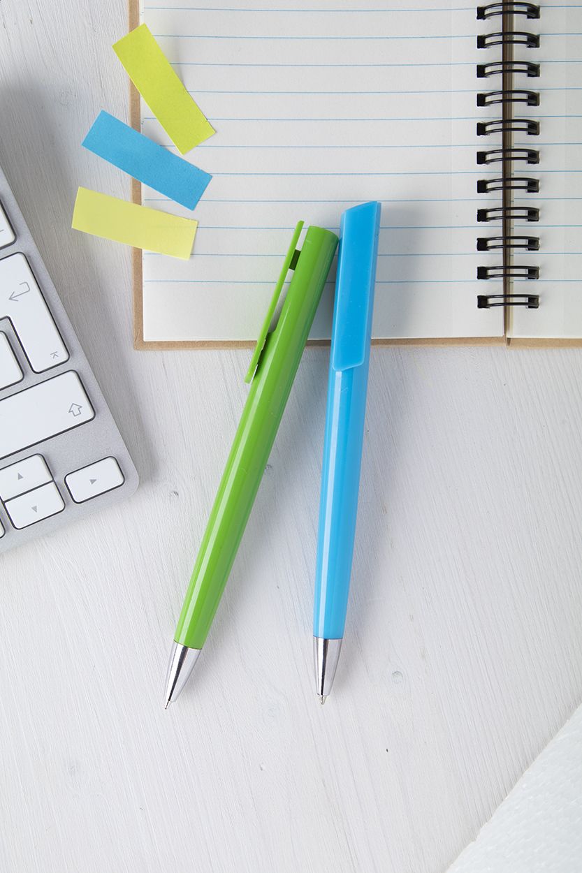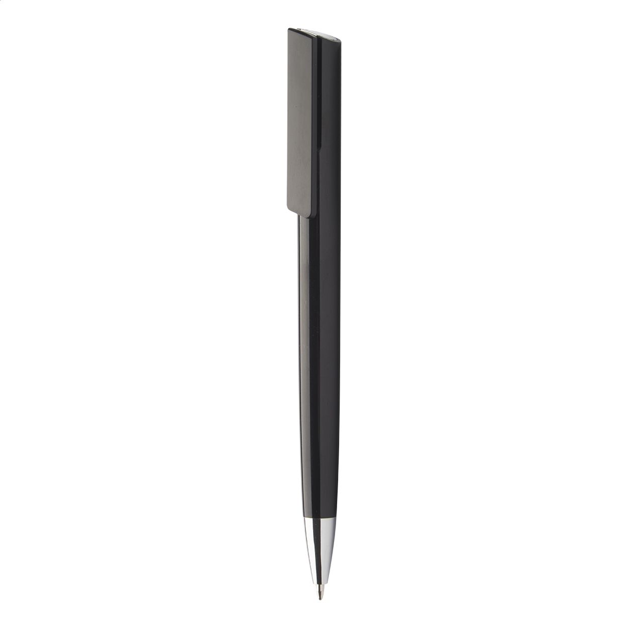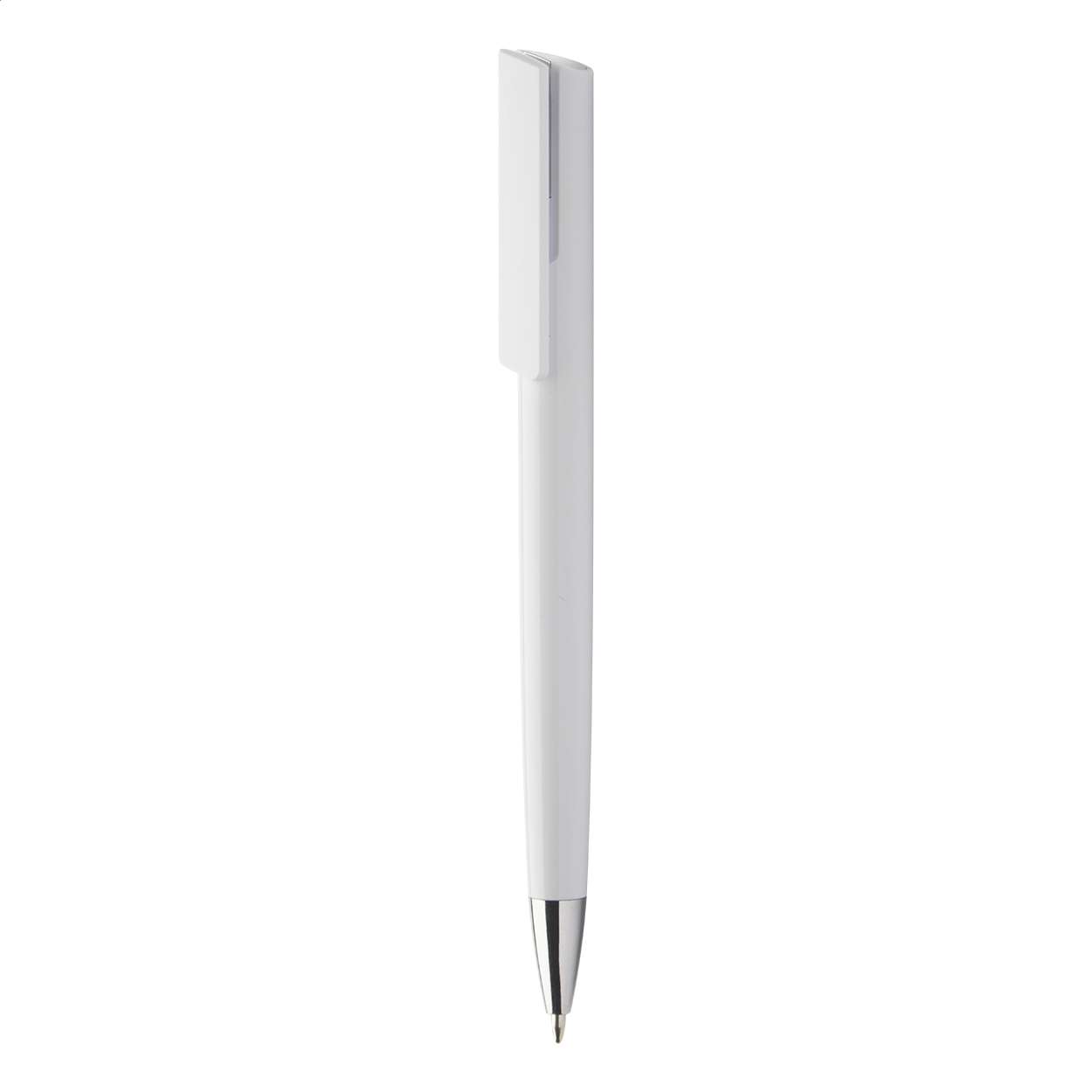 Penna a sfera in plastica con refill blu, punta e terminale cromati.