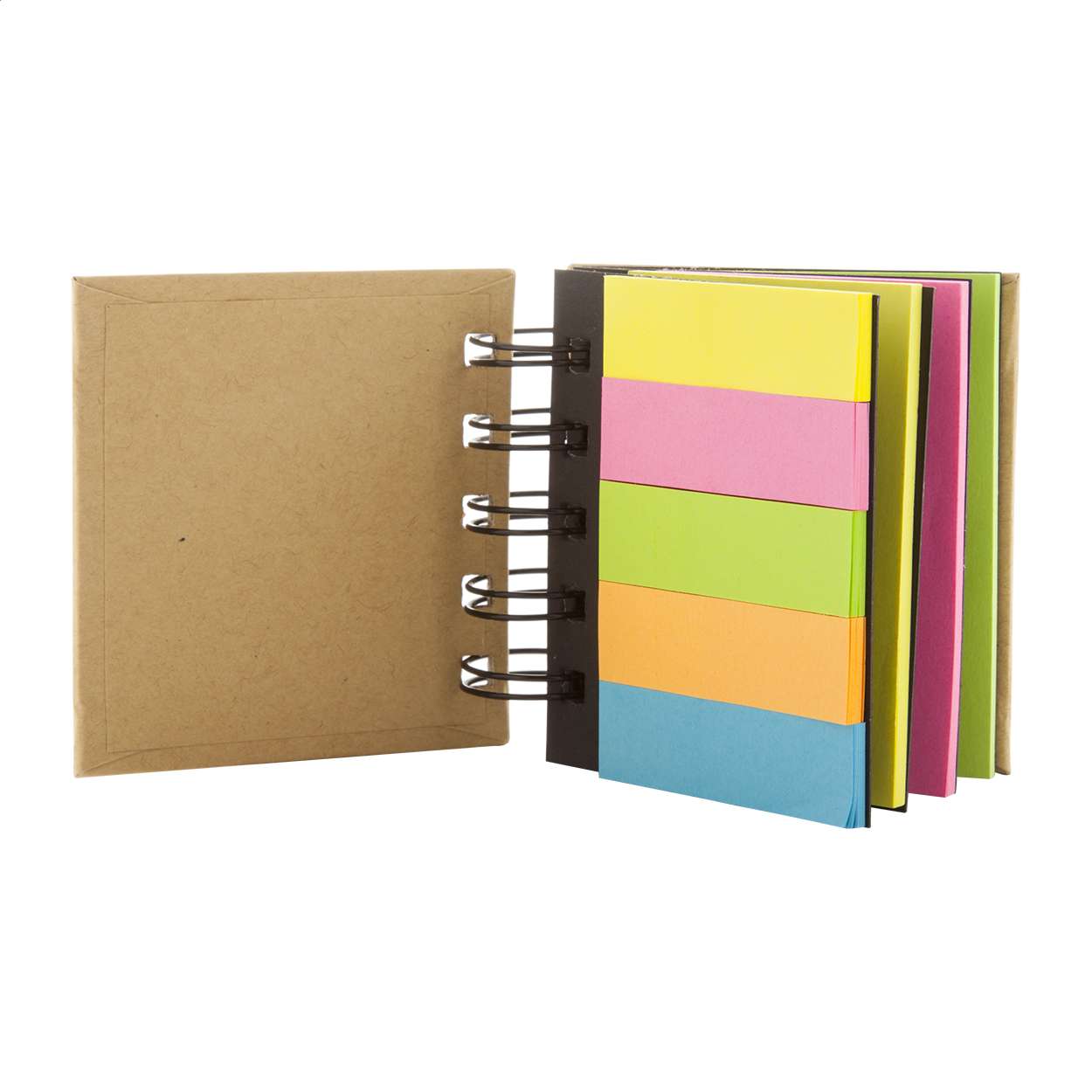 Blocco a spirale in carta riciclata con fogli adesivi di varie dimensioni (5×25 e 3×25 piccoli grandi).