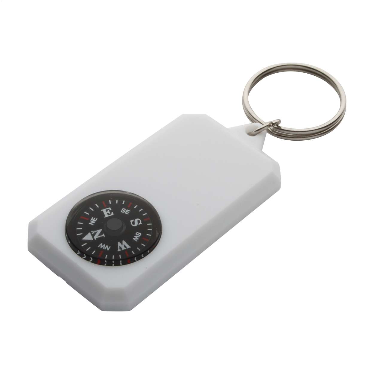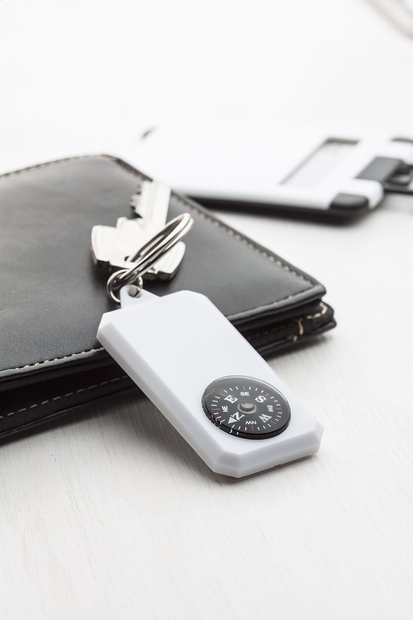 Portachiavi in plastica con bussola e anello in metallo.
