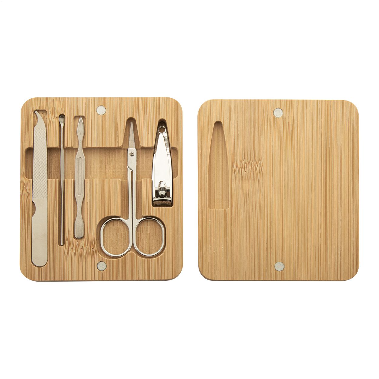 Set per manicure da 5 pezzi in acciaio inox in cofanetto di bambù con coperchio magnetico. Comprende forbici, tagliaunghie, lima per unghie e 2 rimuovi cuticole.