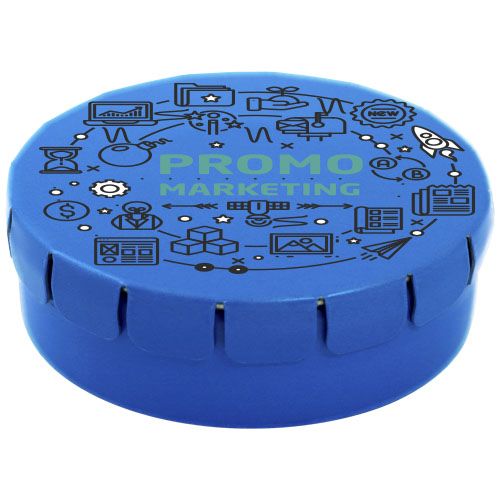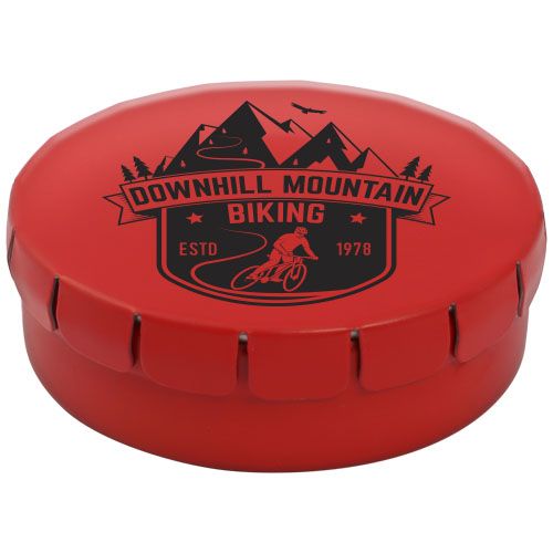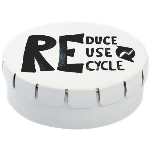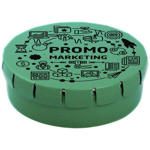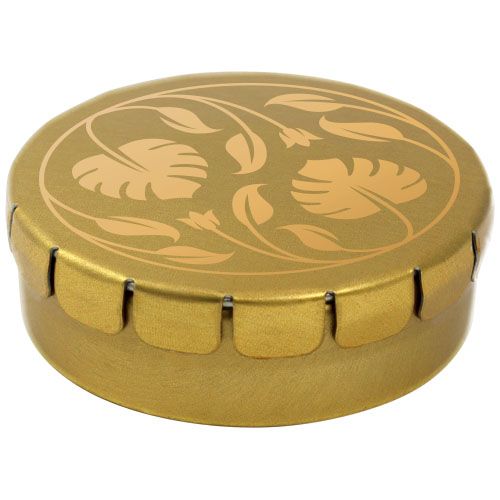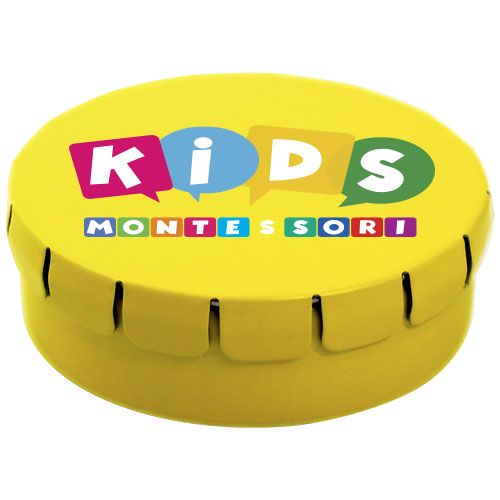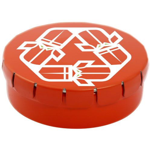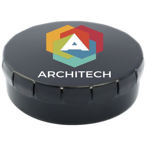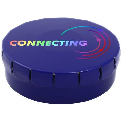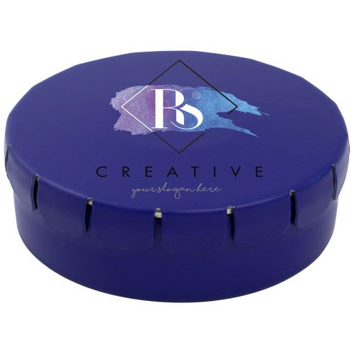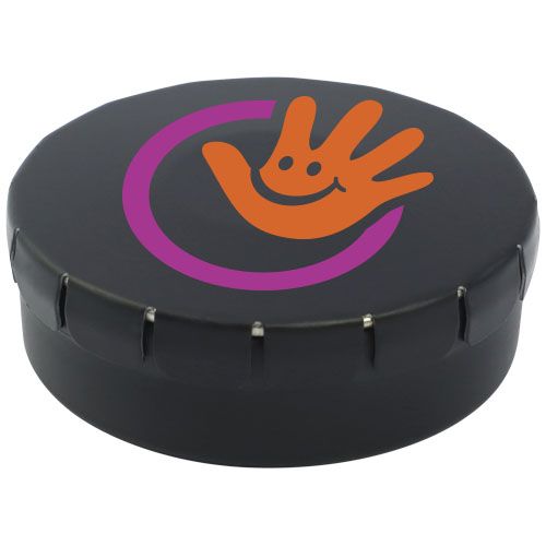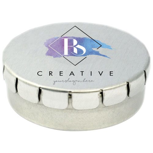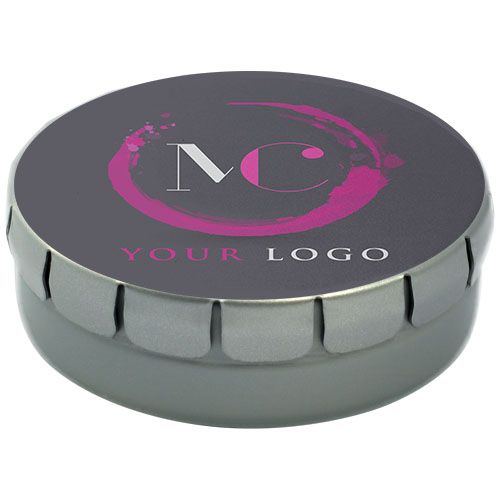 Mentine in contenitore di latta con facile apertura a scatto. Il contenitore può essere ordinato in una vasta gamma di colori e riempito con caramelle dai gusti diversi: mentine tradizionali, mentine extra forti, mentine senza zucchero, gelatine di frutta, caramelle a forma di cuore e al gusto fragola, cannella, caramelle al limone e menta o cioccolatini. Il coperchio può essere decorato con una stampa digitale a colori. Peso netto: 12 g.