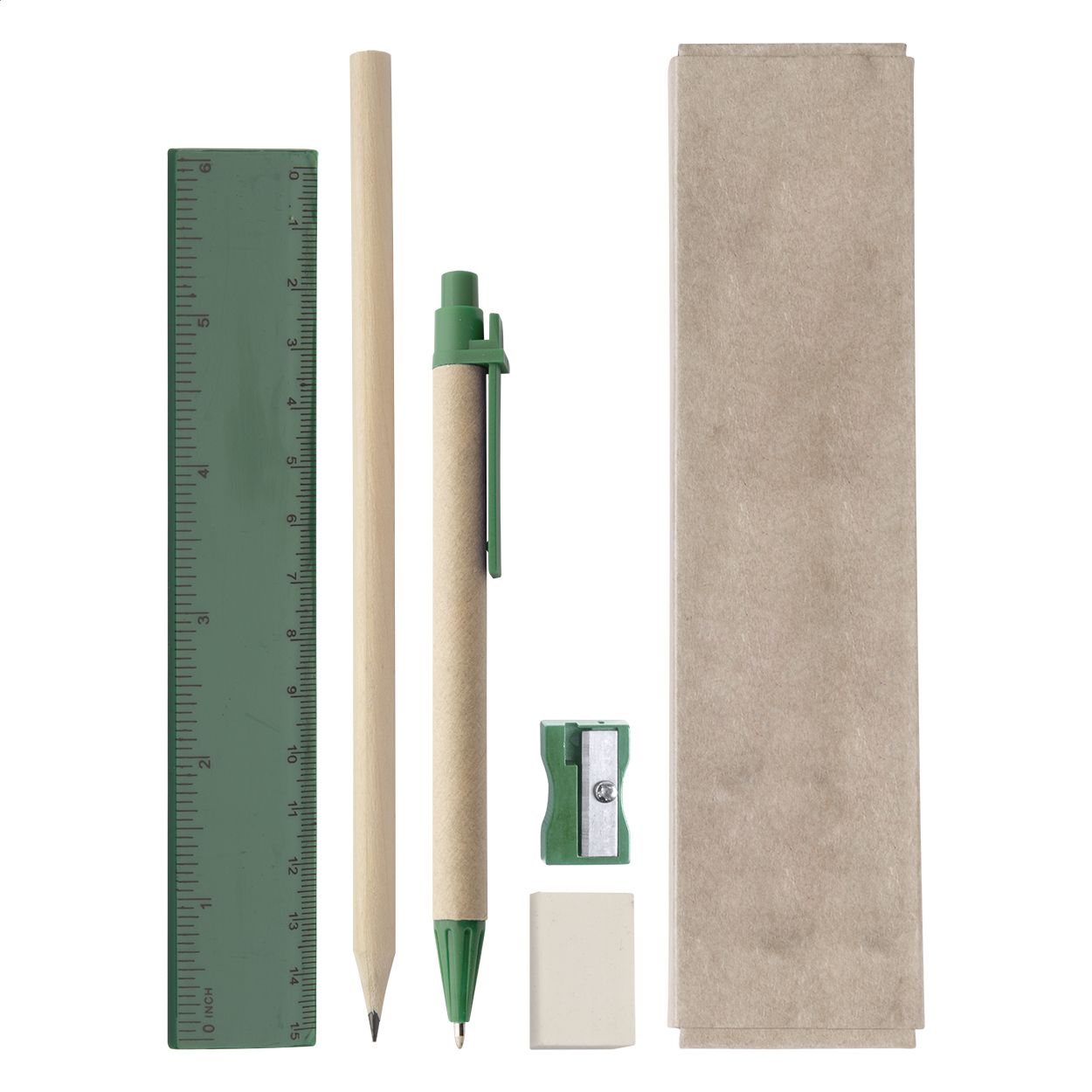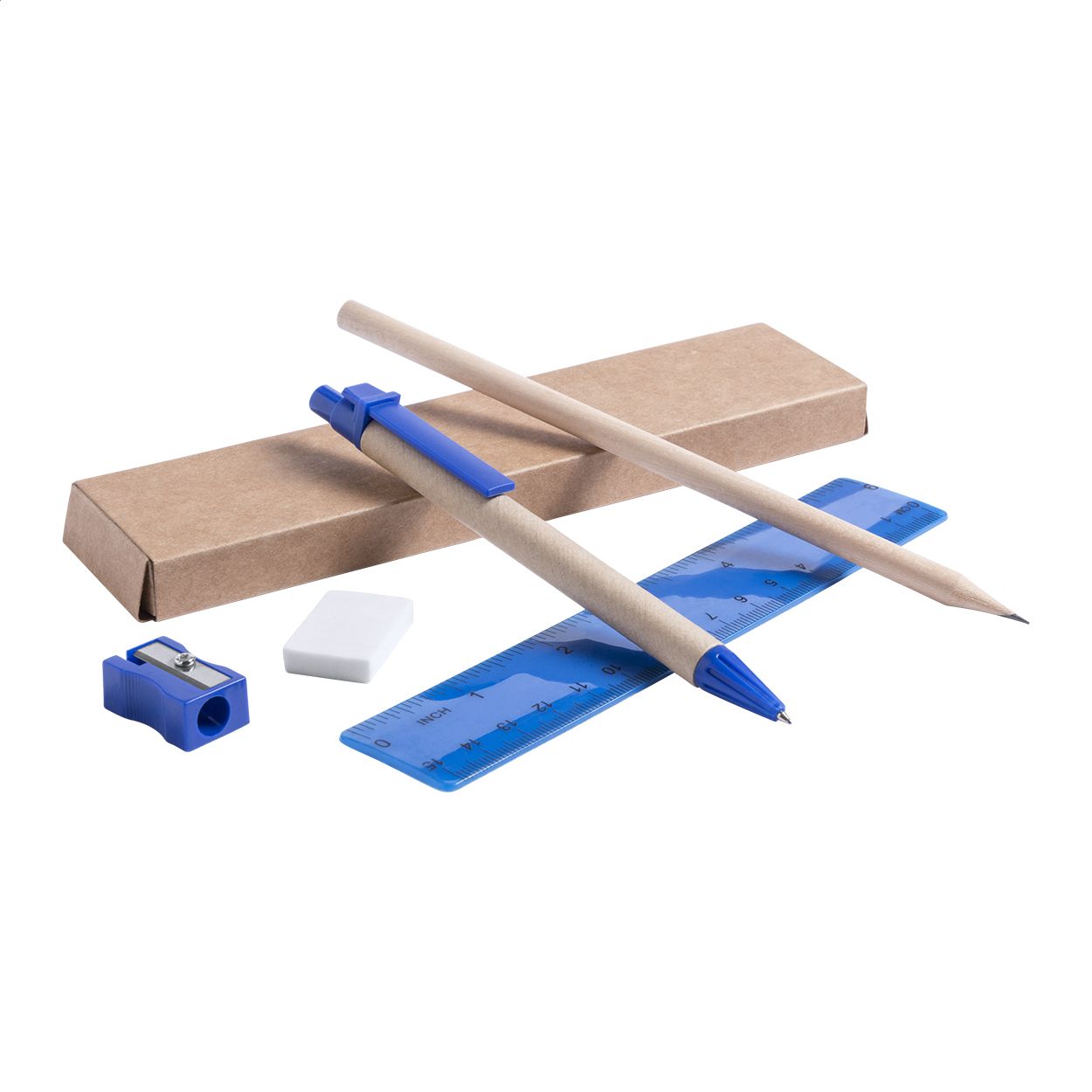 Set cancelleria da 5pz in scatola di cartoncino. Composto da: penna a sfera in carta riciclata (con refill blu), matita, righello, gomma e temperino.