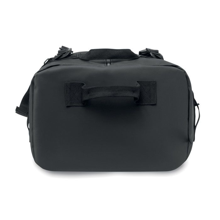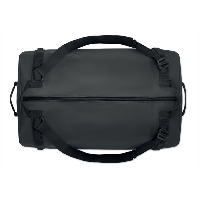 Ampio borsone, borsa per lo sport o per il viaggio, utilizzabile anche come zaino, in telone 50C con scomparto interno con cerniera. Ha una tracolla staccabile e regolabile e una fodera in RPET.