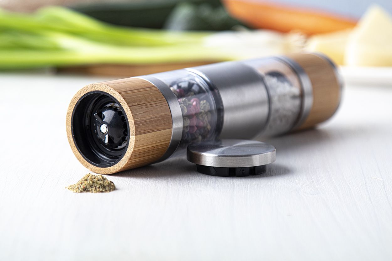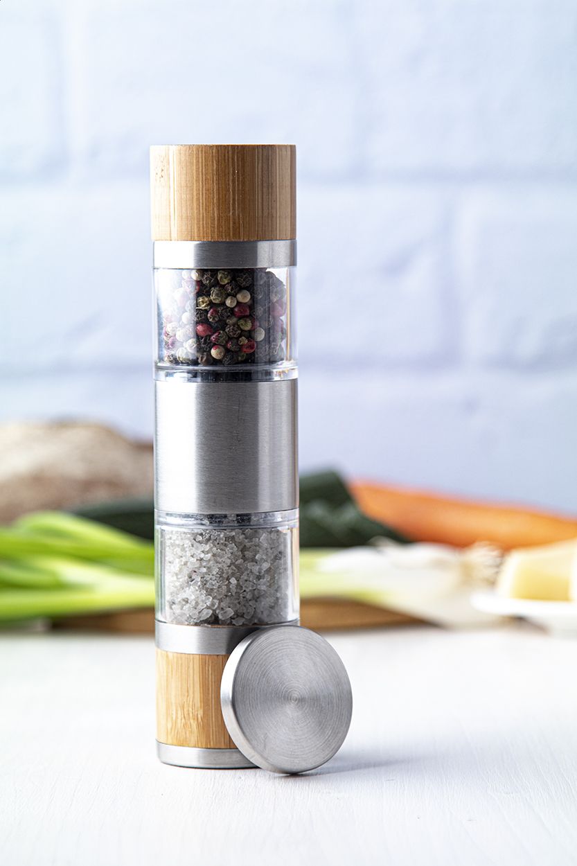 Doppia macina manuale per sale e pepe; macine in ceramica, corpo in acciaio inox e bambù.