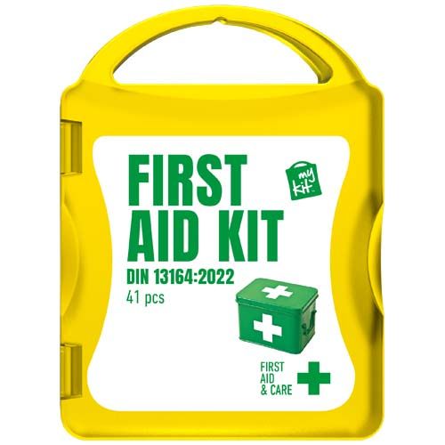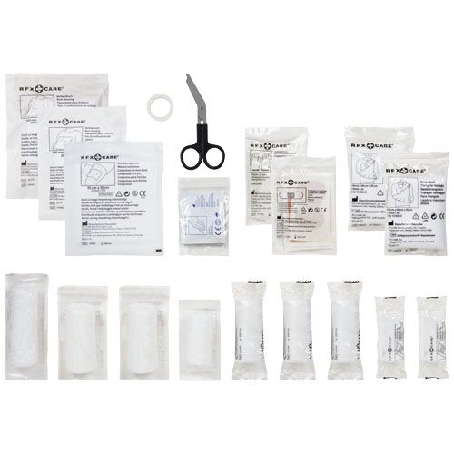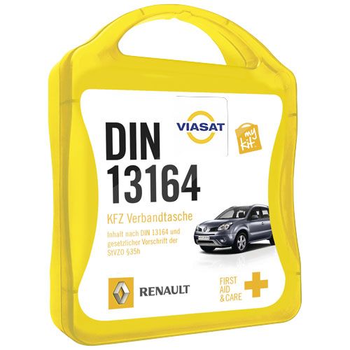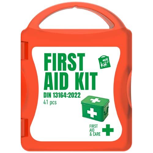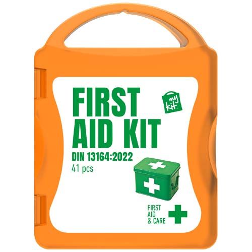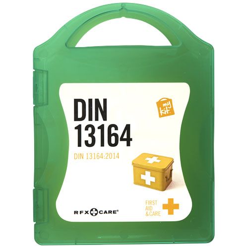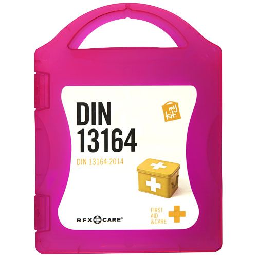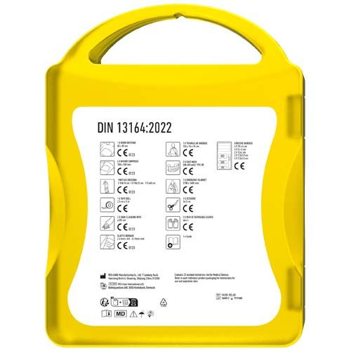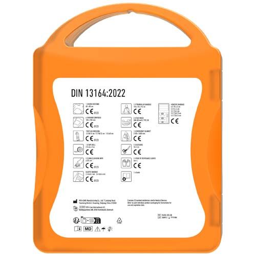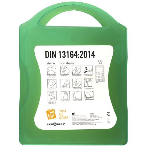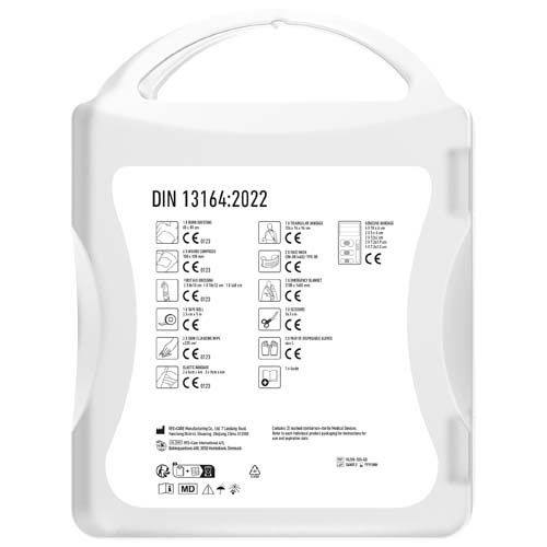 Il kit DIN di primo soccorso ideale, approvato per ogni auto. Un kit di primo soccorso completo è uno strumento utile da tenere a portata di mano in caso di piccoli incidenti. Contenuto: 3 garze di primo soccorsos 8 m x 10 cm, 1 garza di primo soccorso 10 m x 12 cm, 2 garze per ustioni 40 x 60 cm, 1 burn dressing 60 x 80 cm, 3 garze per ferite, 2 benda elastica 4 m x 6 cm, 3 benda elastica 4 m x 8 cm, 1 forbice, 1 guida al primo soccorso, 1 nastro adesivo per benda, 8 garze adesive, 2 paia di guanti monouso, 2 bende triangolari, 1 coperta primo soccorso, 2 salviettine disinfettanti, 2 cerotti per dita 70 x 40 mm, 2 cerotti per dita 120 x 20 mm, 2 cerotti 72 x 19 mm. Tutti i prodotti contenuti nei MyKit rispettano le norme Europee vigenti. I prezzi includono stampa all-over fronte e retro.