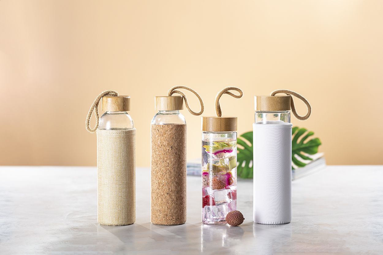 Borraccia da 500ml. in vetro, con rivestimento in sughero naturale e tappo in bambù. Non adatta per l'utilizzo con bevande gassate.