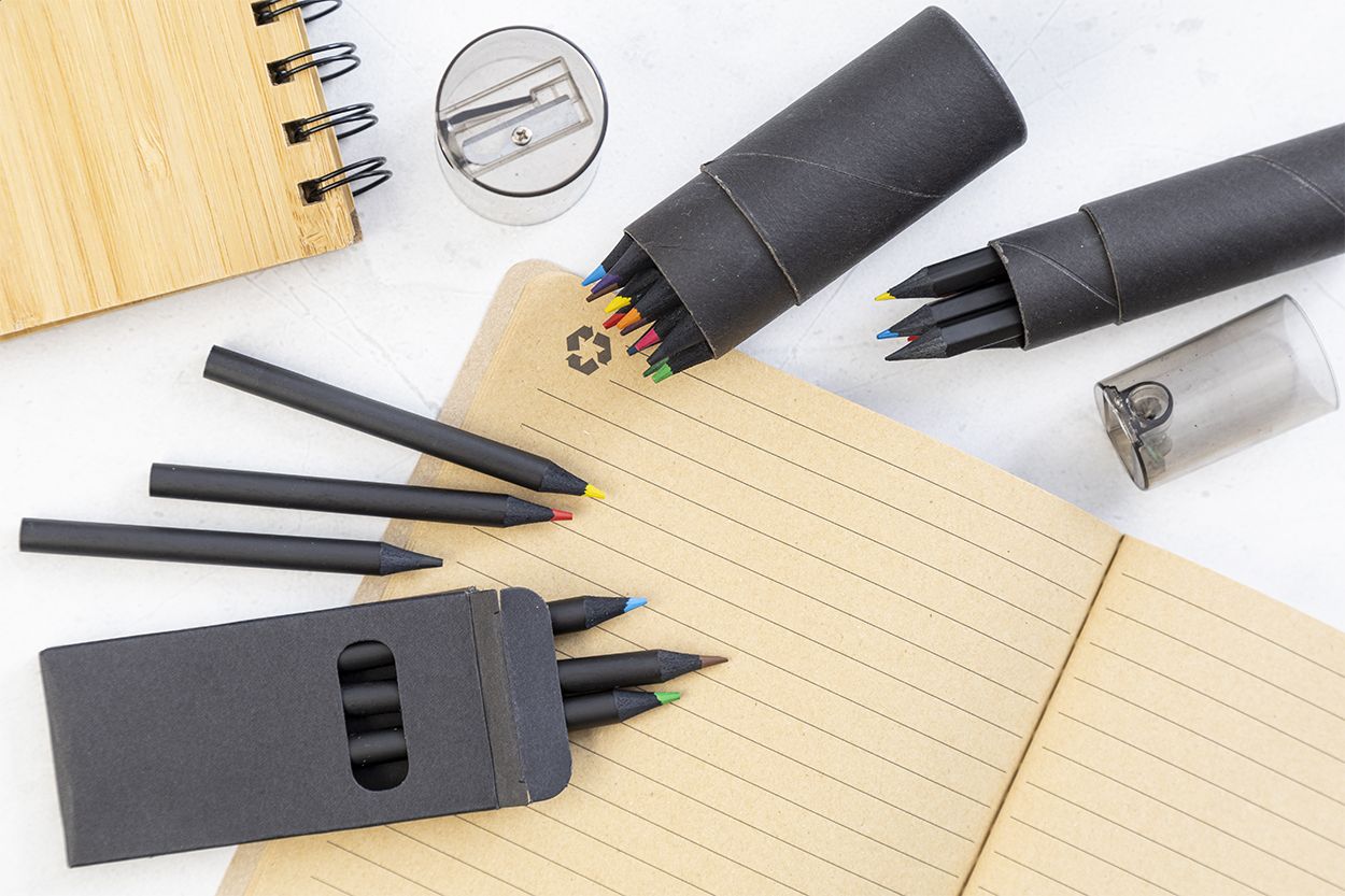 Set di 12 matite in legno nero contenute in un astuccio di cartoncino nero e temperamatite in plastica.