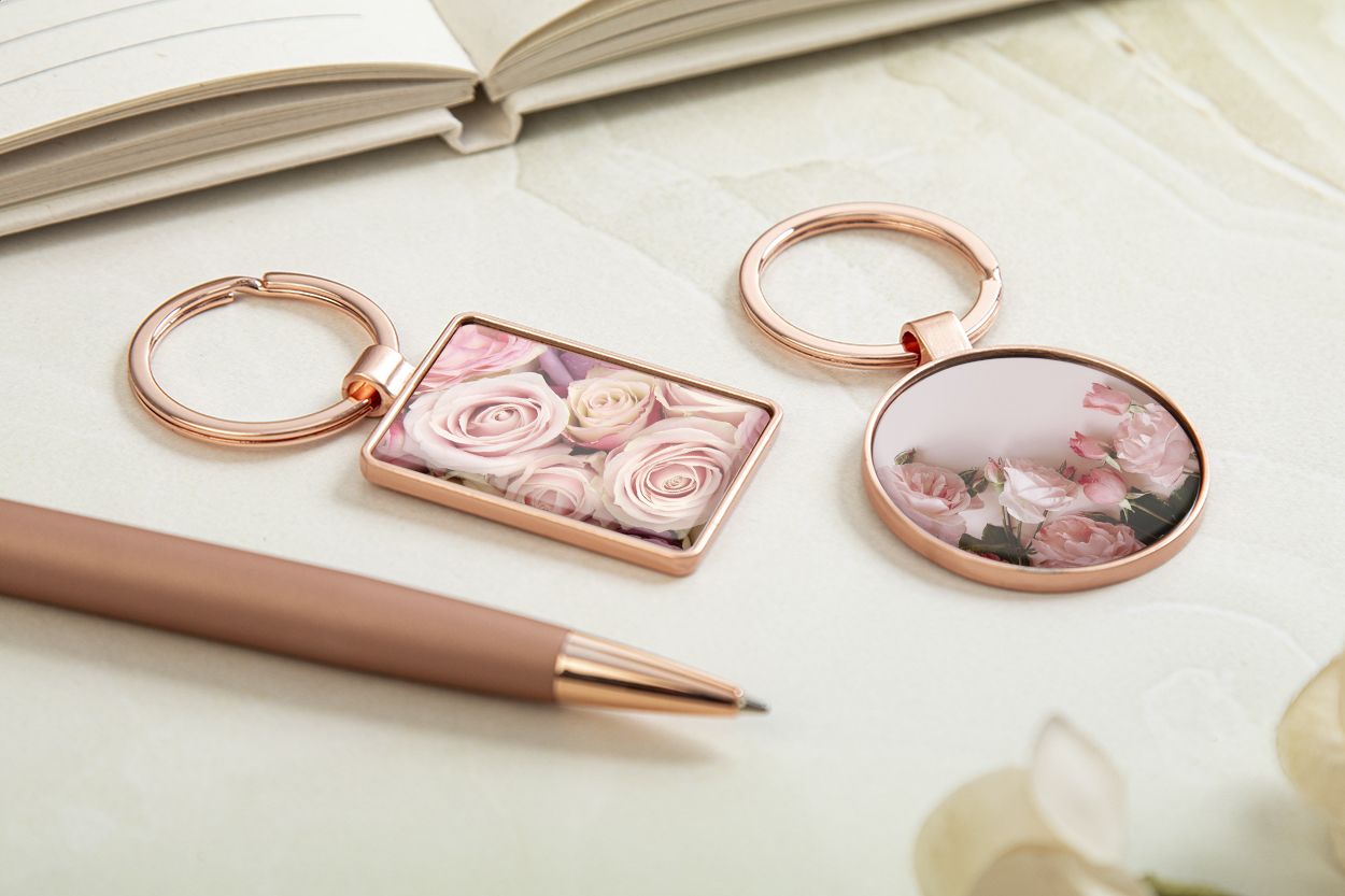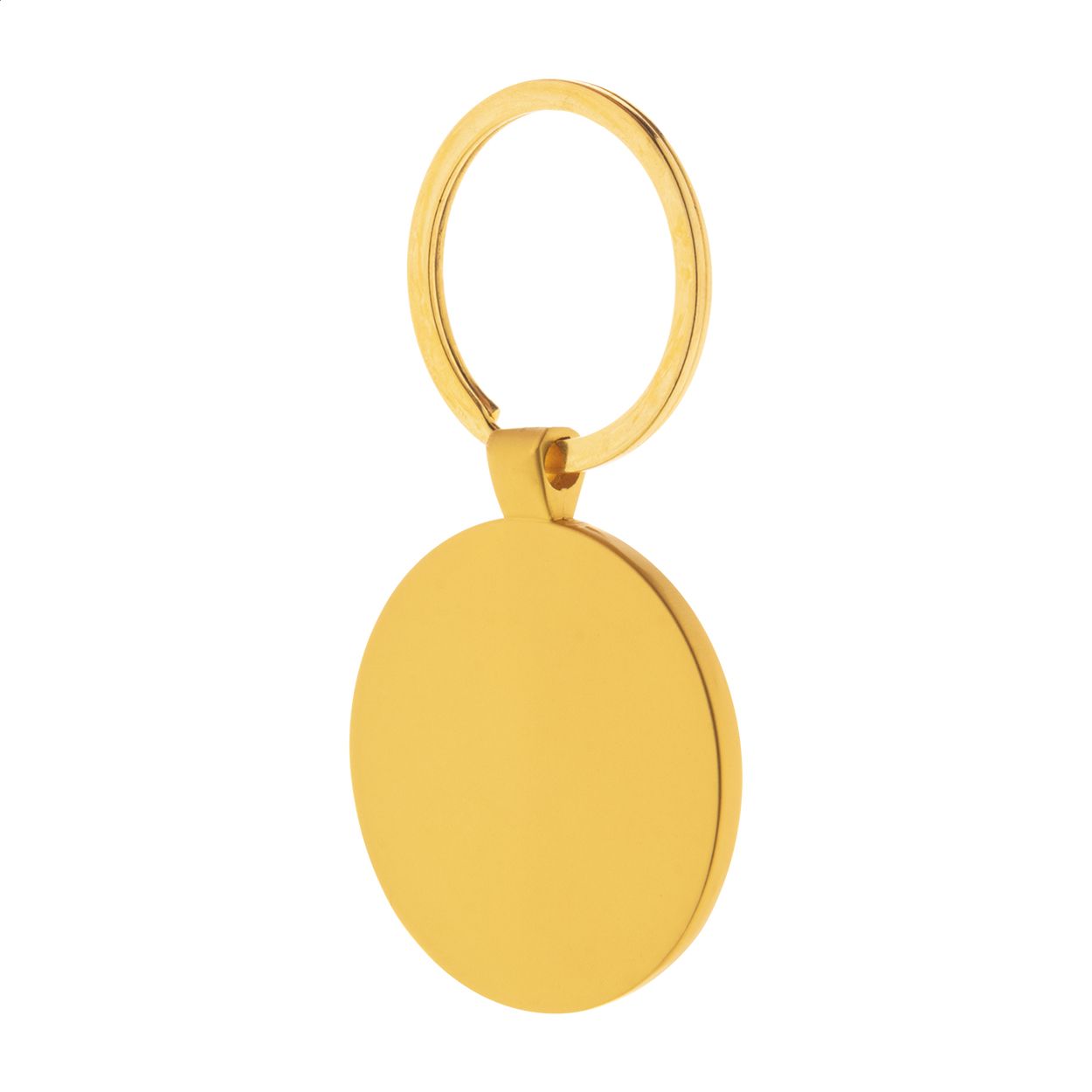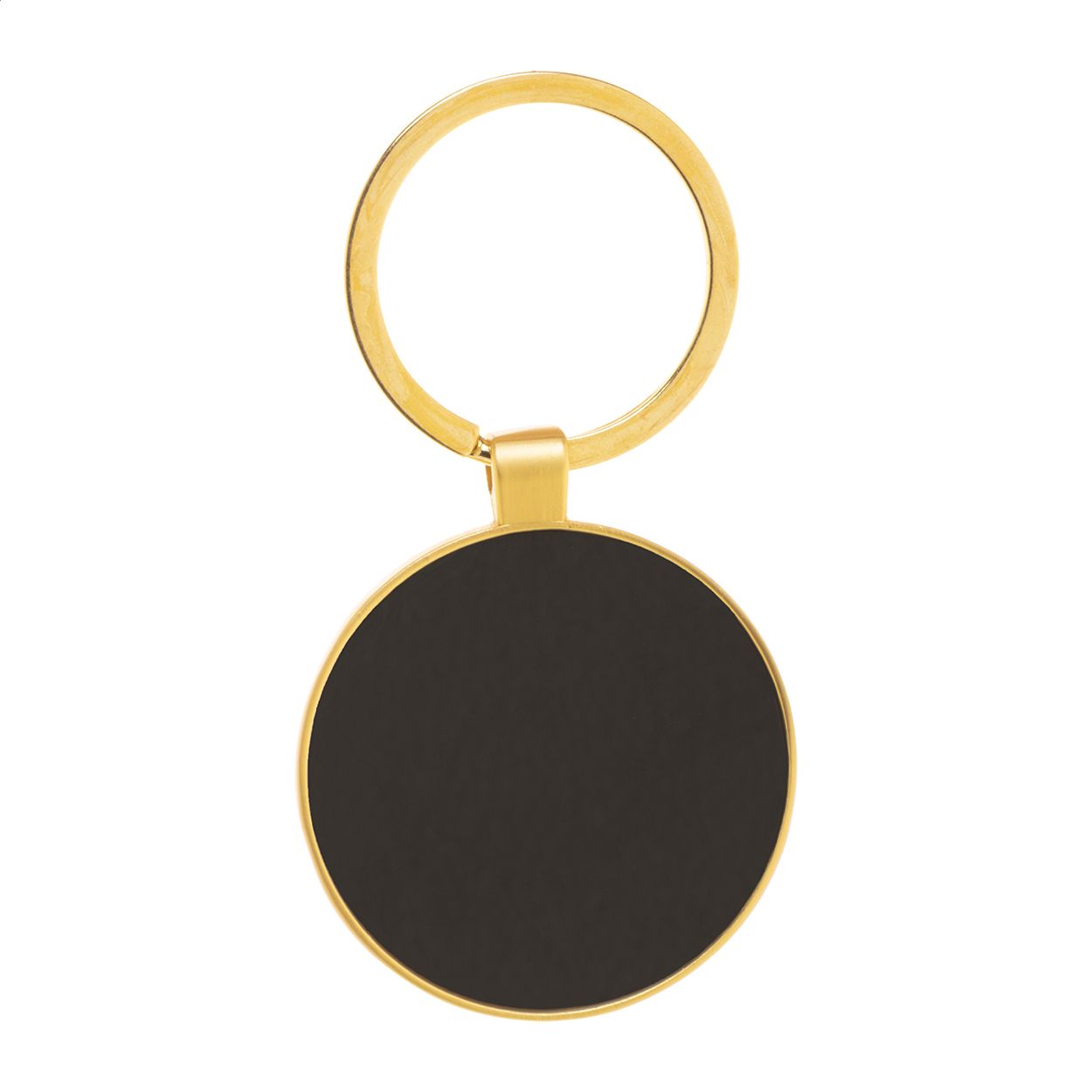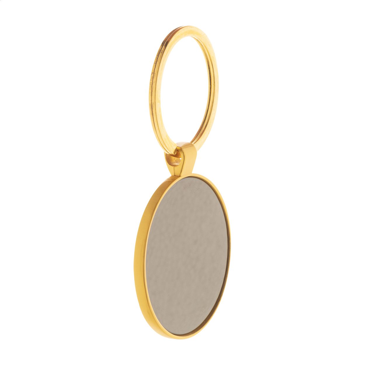 Portachiavi ovale in metallo con finitura dorata e placca color canna di fucile. Confezione in scatola di cartoncino kraft.