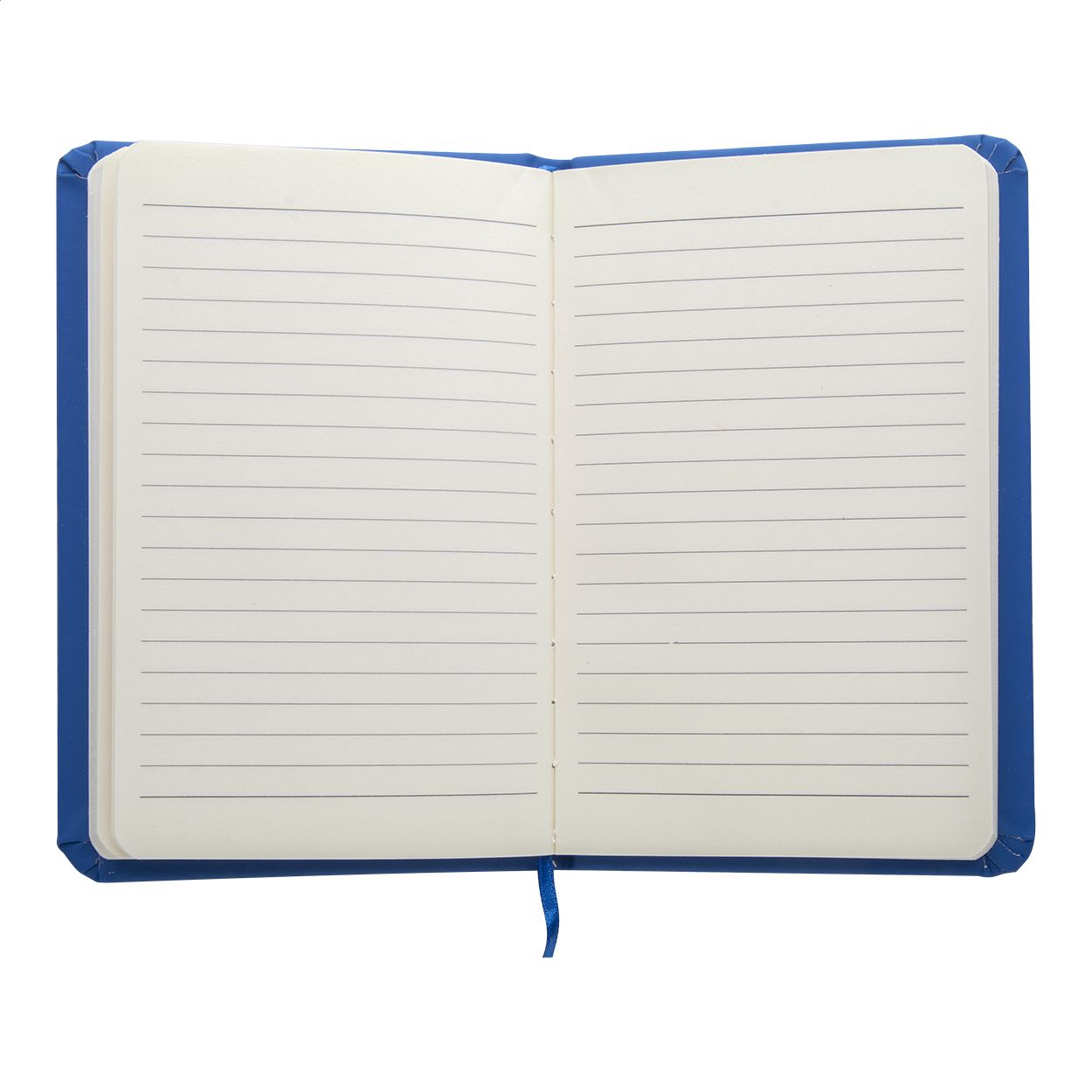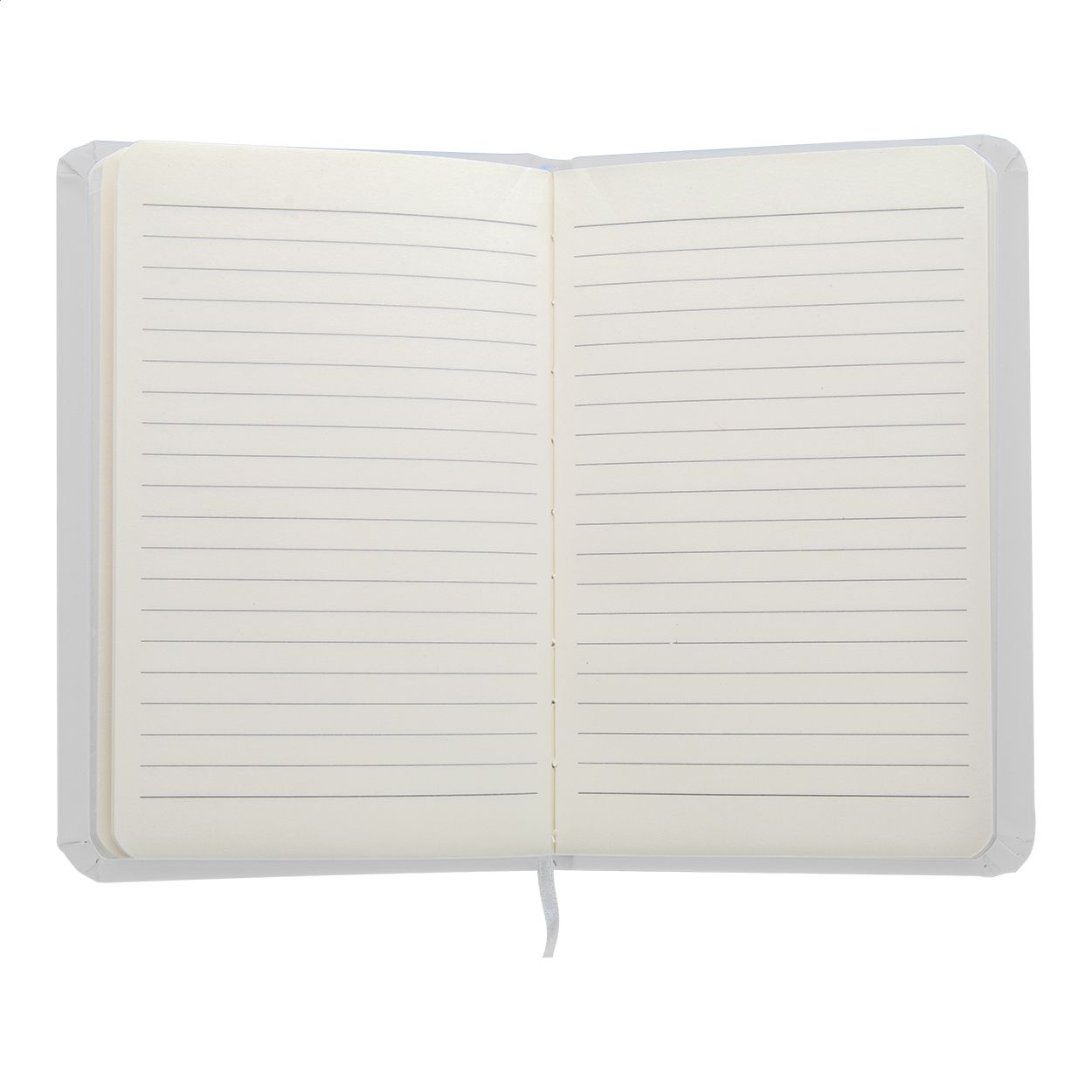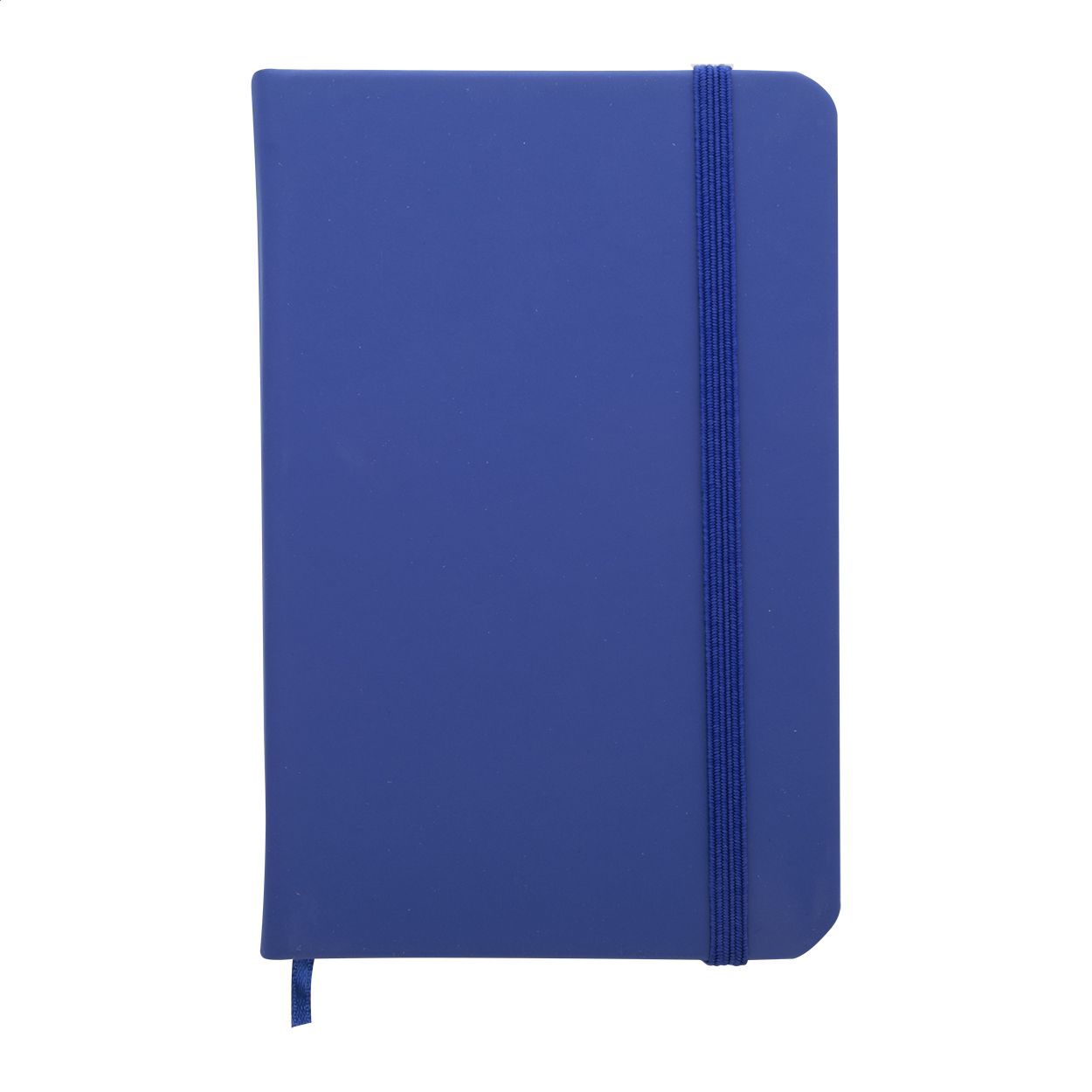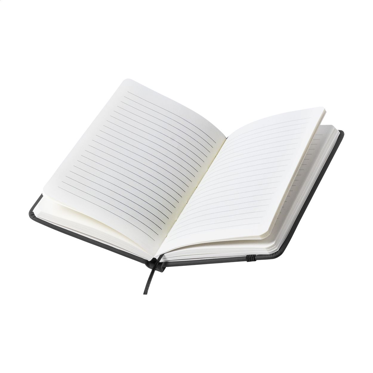 Quaderno con rivestimento in finta pelle, 100 fogli a righe, segnalibro e cinturino in gomma coordinati. Formato A6.