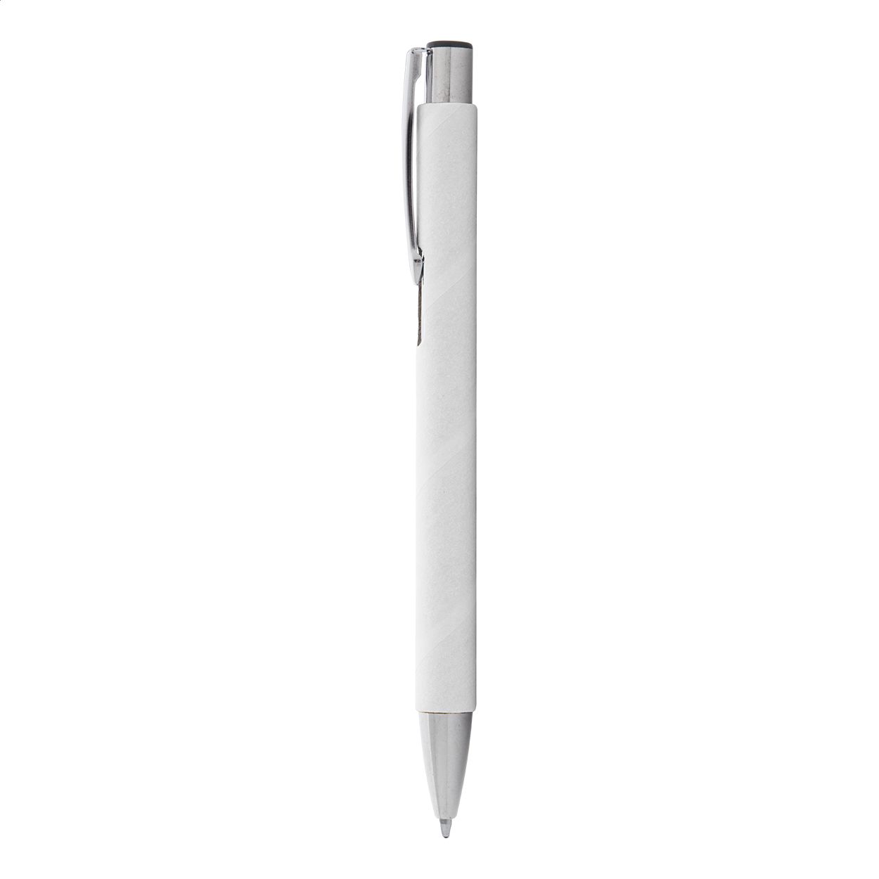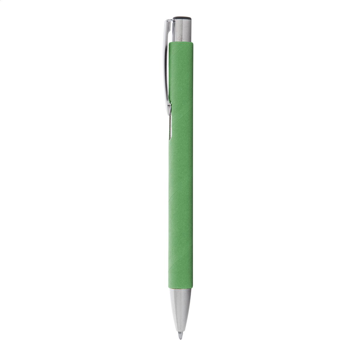 Penna a sfera in carta riciclata con parti in metallo e refill blu.