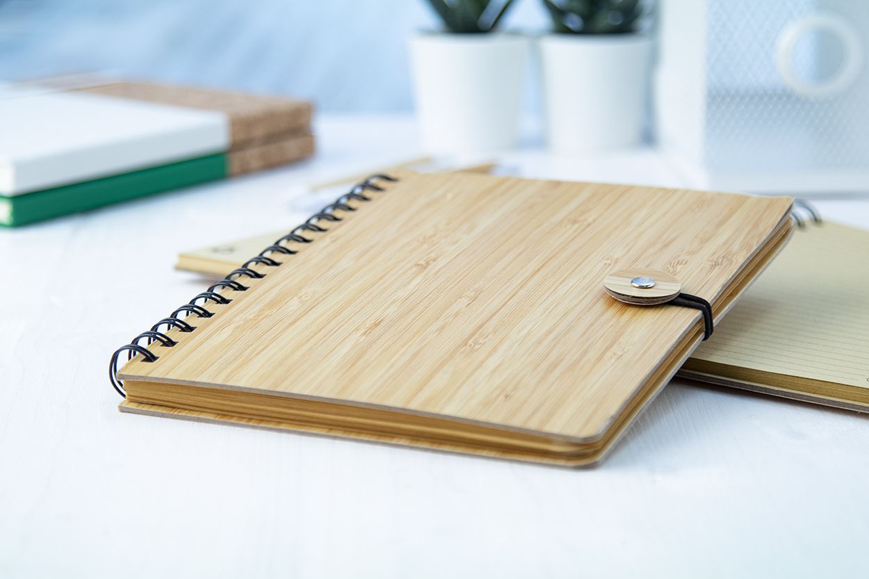Quaderno a spirale con 80 fogli a righe e copertina in bambù.