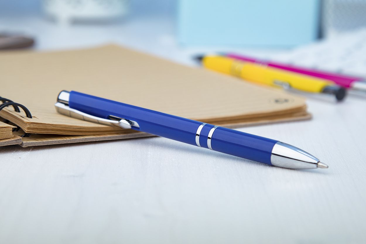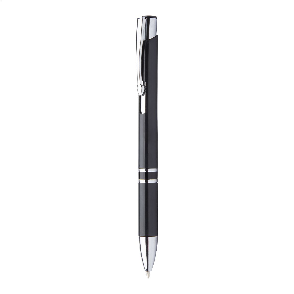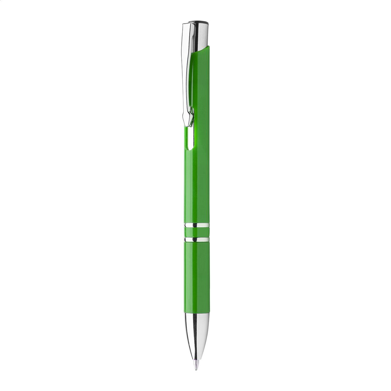 Penna a sfera in plastica con clip e puntale cromato. Fornita con refill blu.