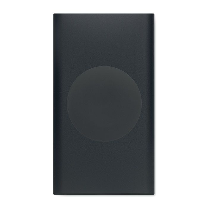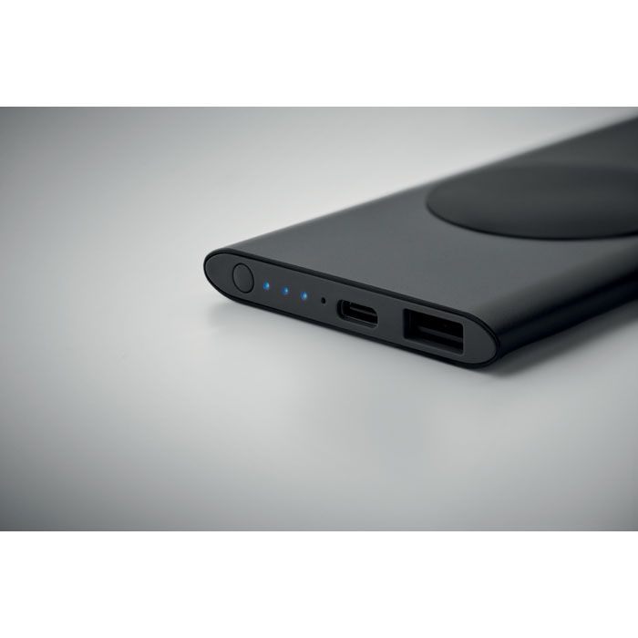 Power bank 5000 mAh con ricarica wireless 15W in alluminio riciclato. Ingresso: tipo C. Uscita: 1 x tipo C e 1 x tipo A. Corrente in uscita DC5V/2A.