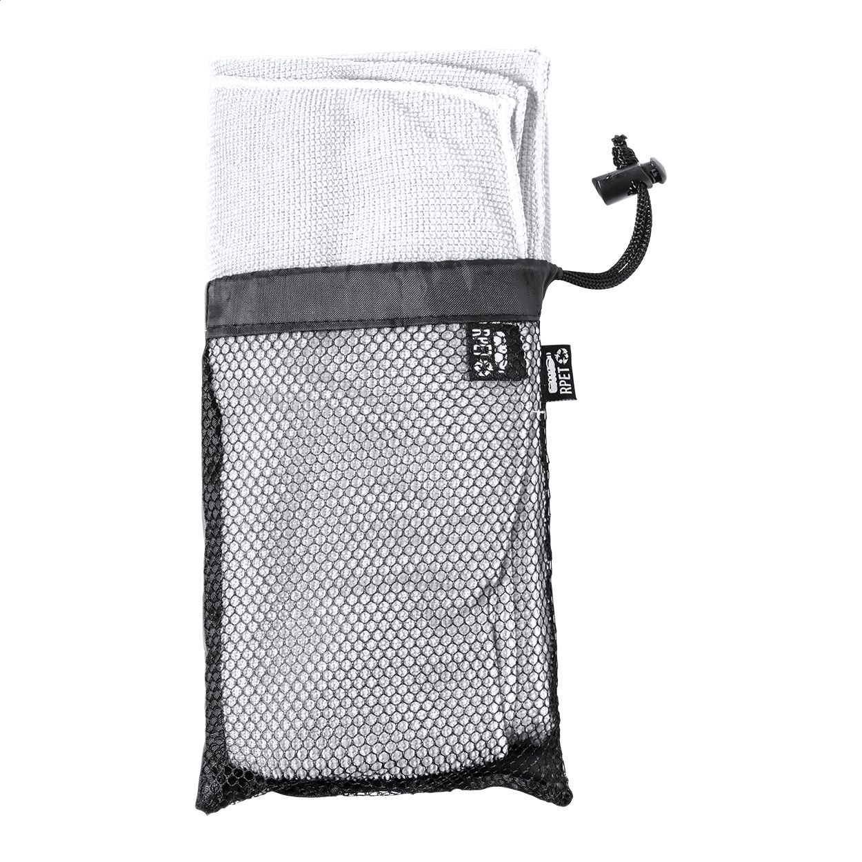 Asciugamano in microfibra di poliestere RPET da 160 g/m² con etichetta distintiva RPET.