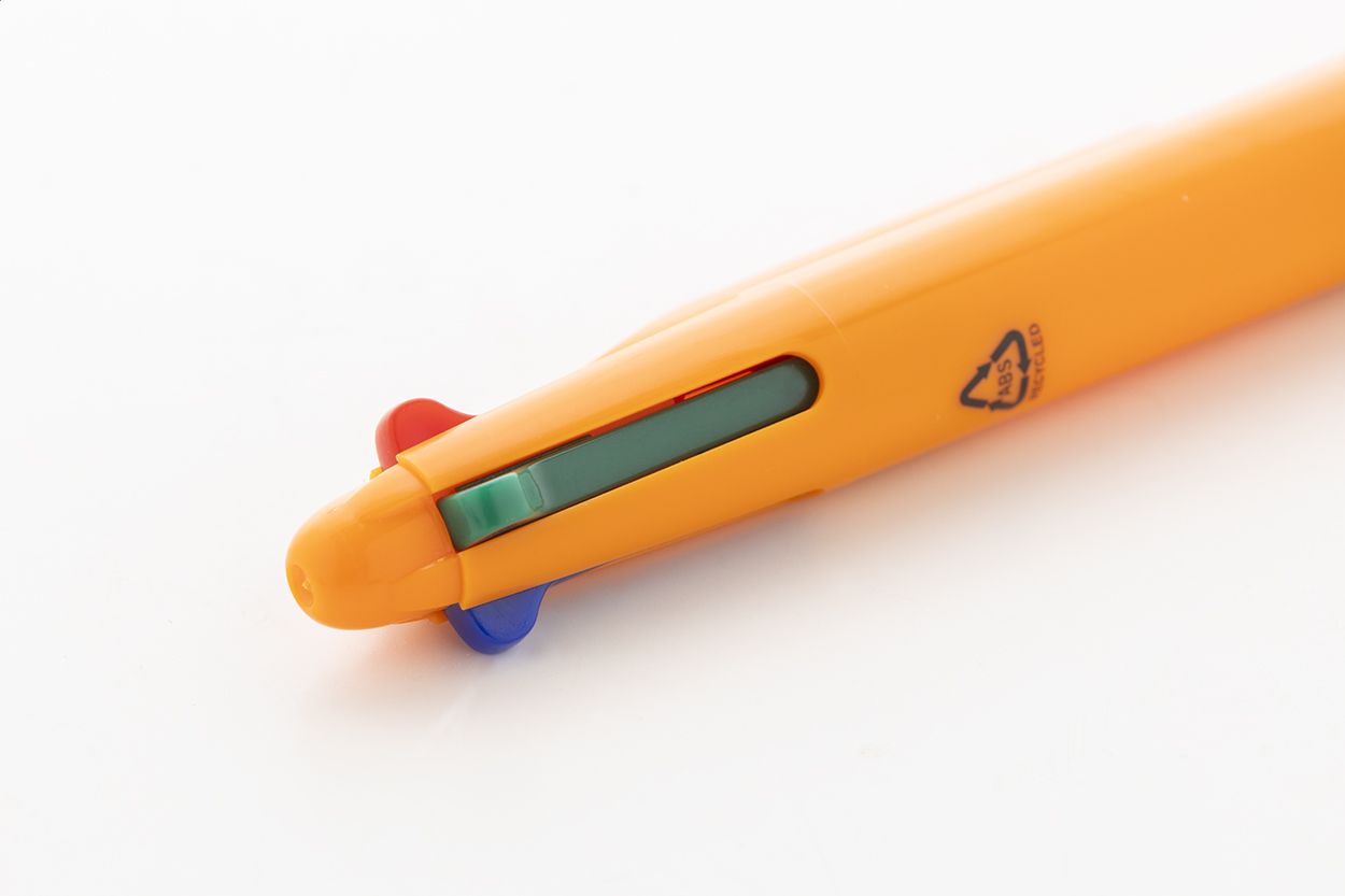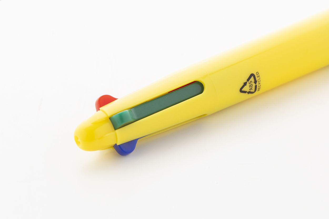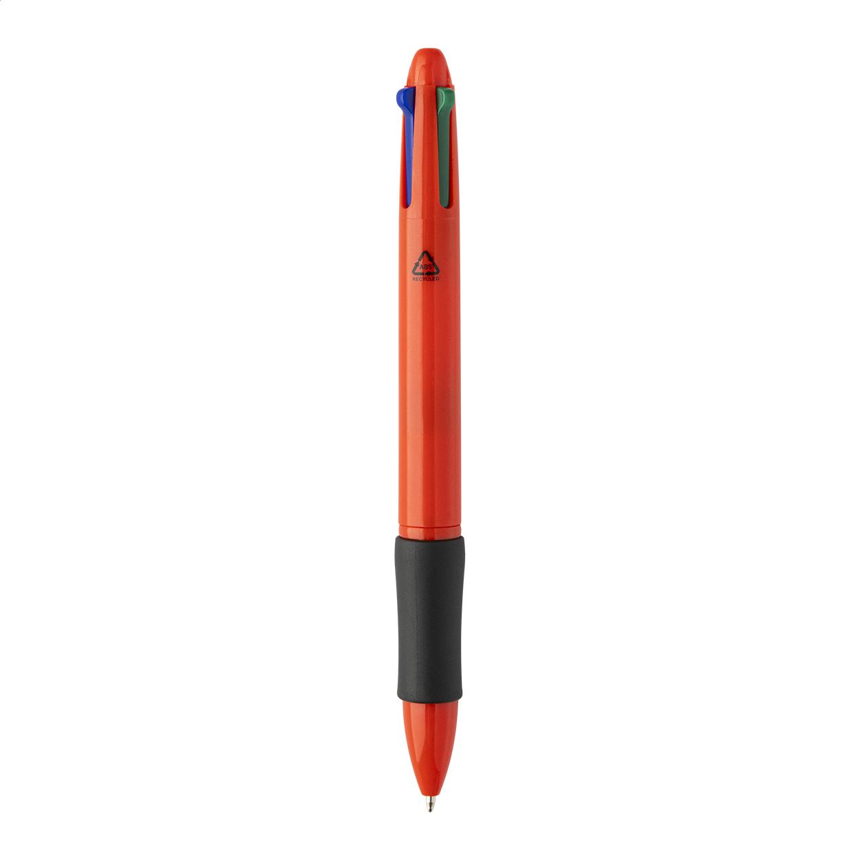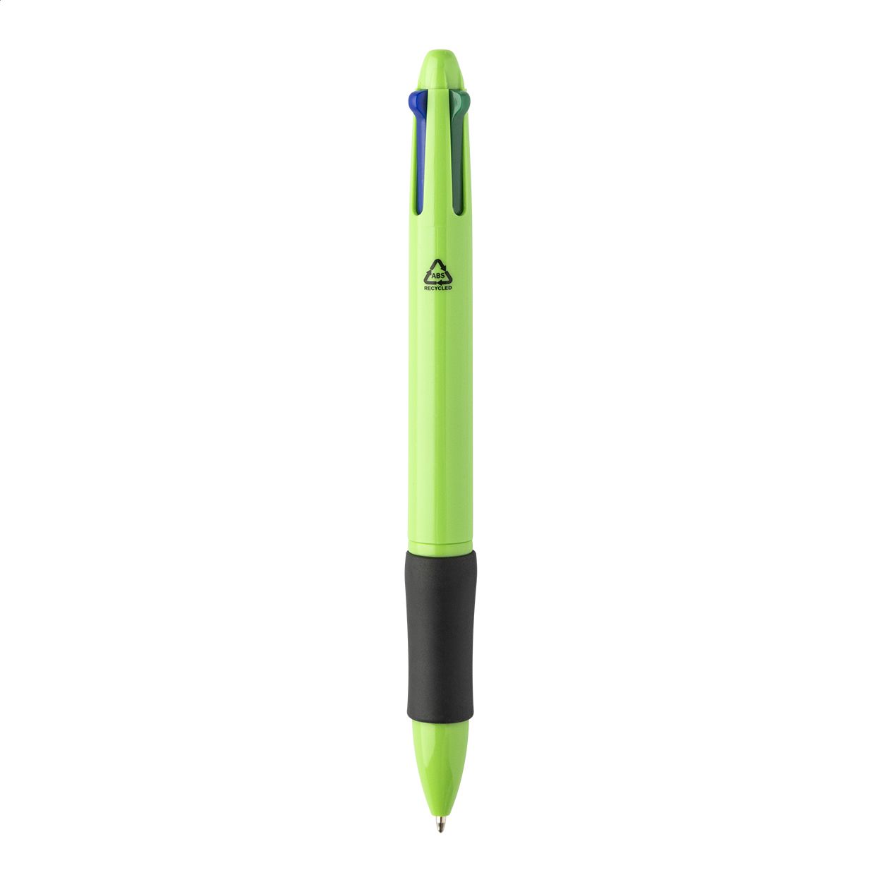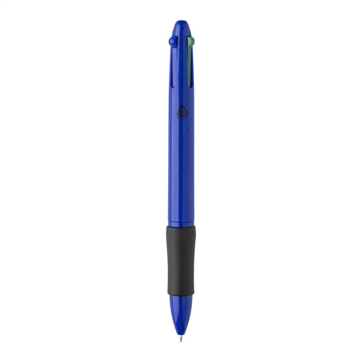 Penna a sfera multicolore in ABS riciclato con impugnatura in gomma. Refill nei colori nero, blu, rosso e verde.